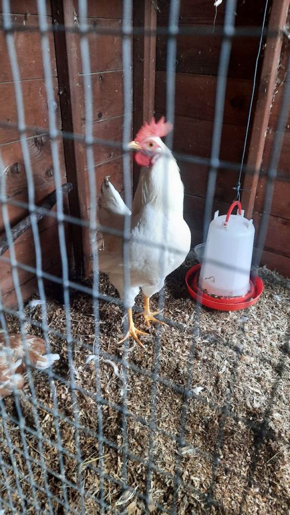White leghorn Cockerell 6 months old friendly bird would make a lovely pet .