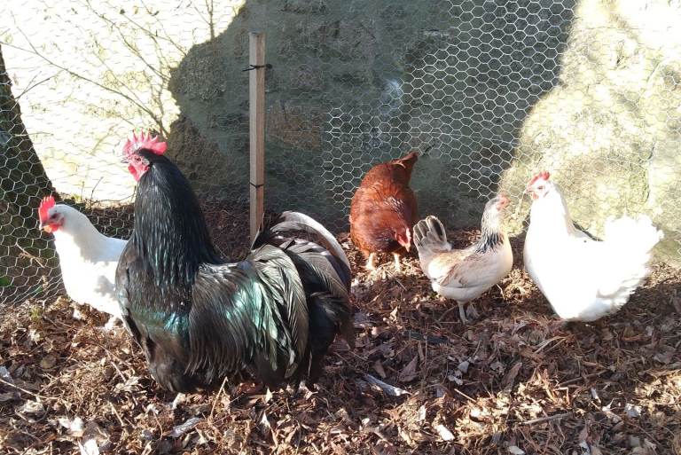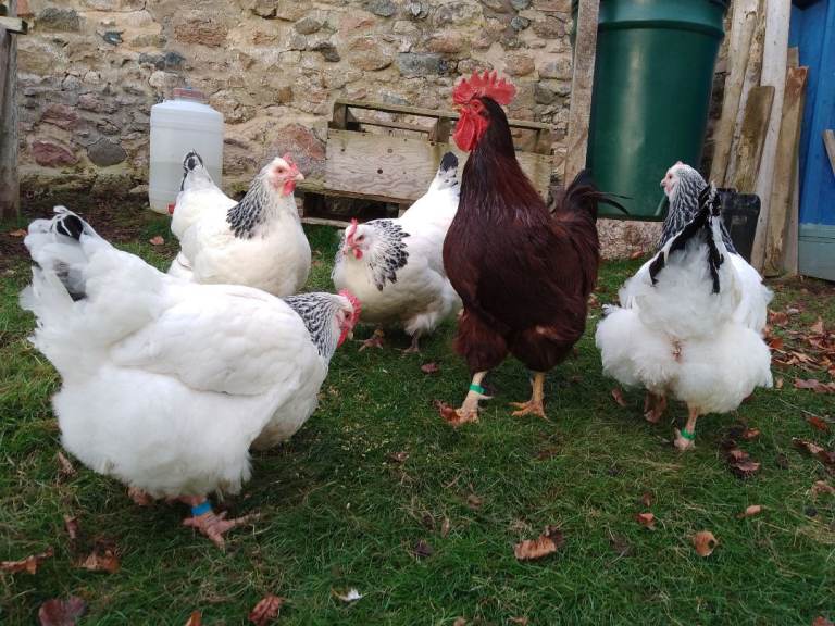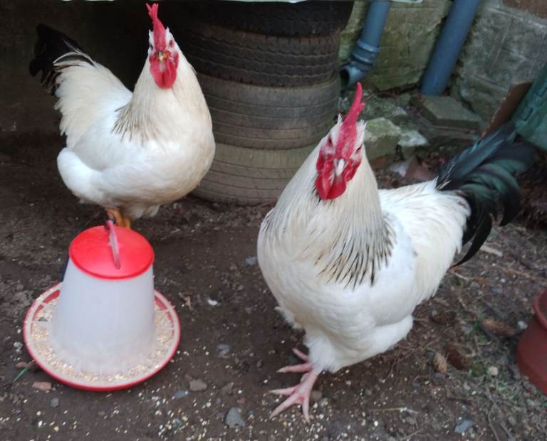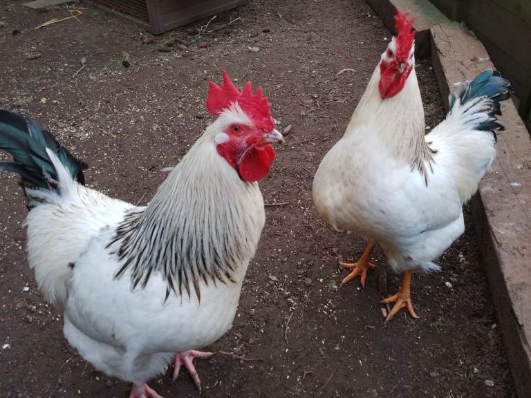 * 2 Goldline 30 week old cockerels who resemble their Light Sussex Mum's and gentle natures, £10 each. Photos 8+19