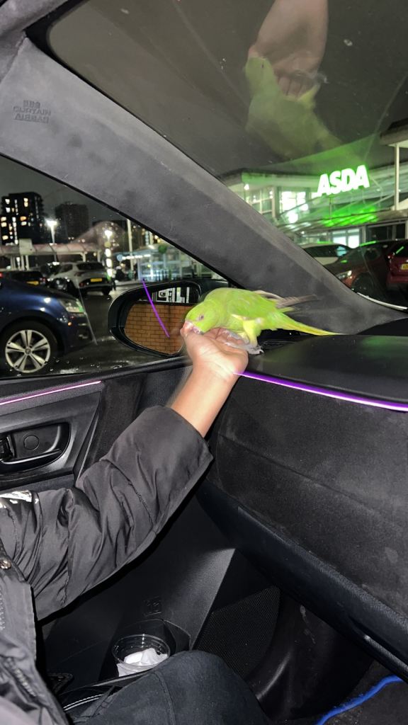 Mimics and talks to itself , understand once comfortable friendly and very nice bird , had it as a baby grew up with loads of kids around so it’s calm and comfortable with kids , selling as I am going holiday and no one to take care of , I wouldn’t let go but I can’t keep it