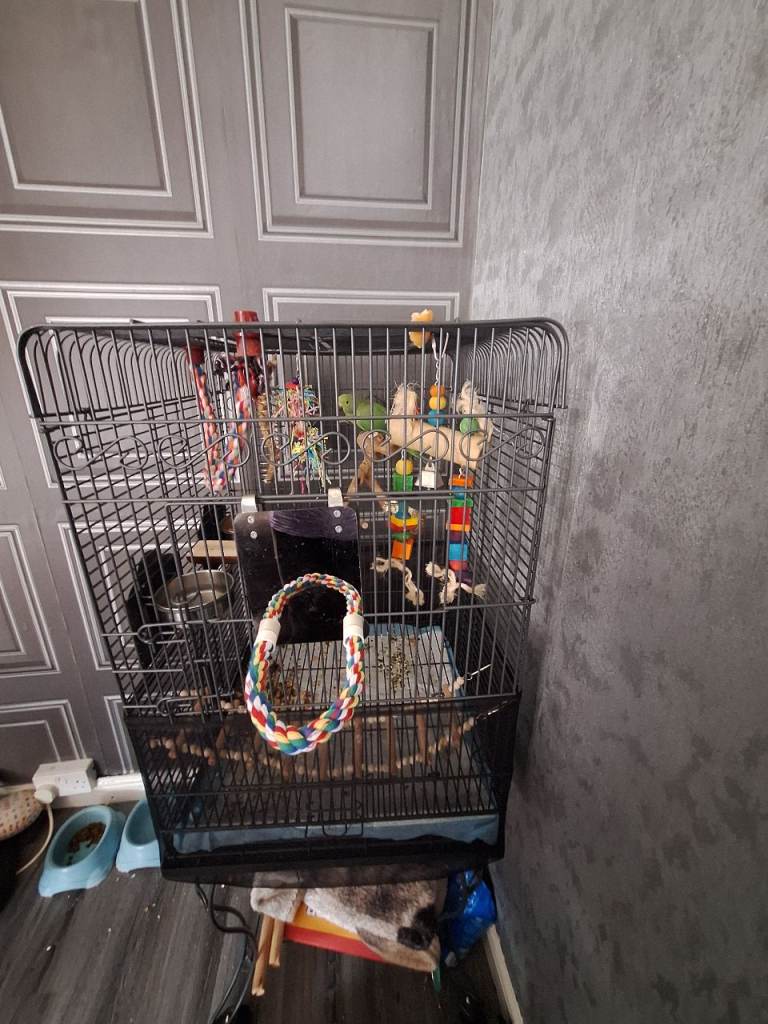 Will come with large cage on stand, toys, food, treats.