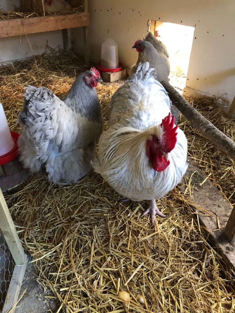 4 Isabel Orpington hens 6 months and 1 Isabel Orpington Cockerel 8 months . Two of the hens have just started to lay