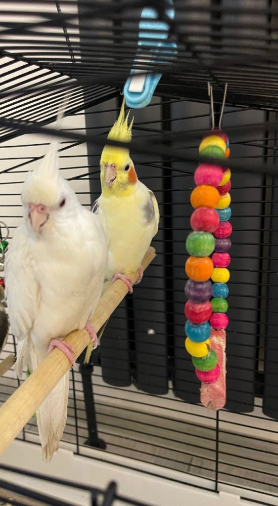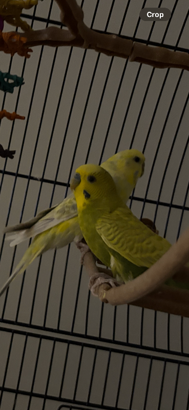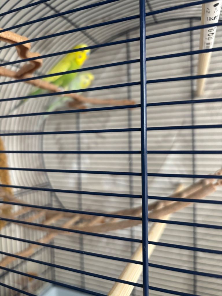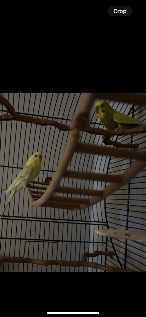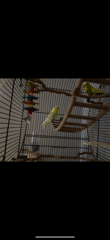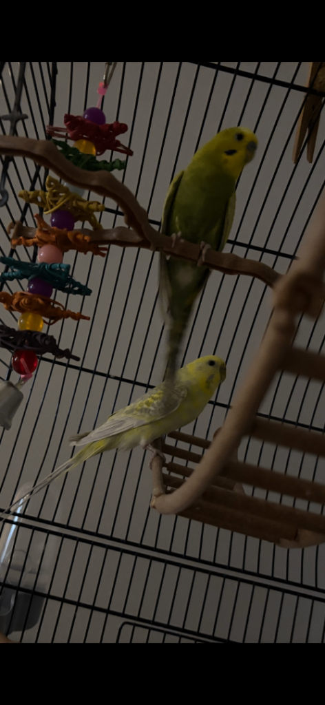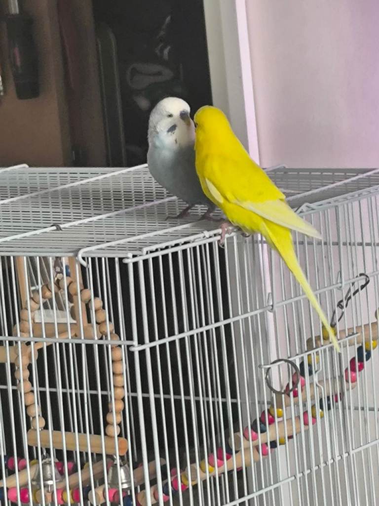 Two cute and friendly budgies with large cage. They have shared the cage since we got them over a year ago and are best friends always chirping a kissing each other. We can’t keep them now due to moving. I think it’s a male and a female.