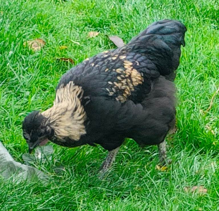 Satin giant ( silkie x jersey giant) cockerel. Very gentle looking for his new home as his dad started attacking him. Good temperament. Soft crow