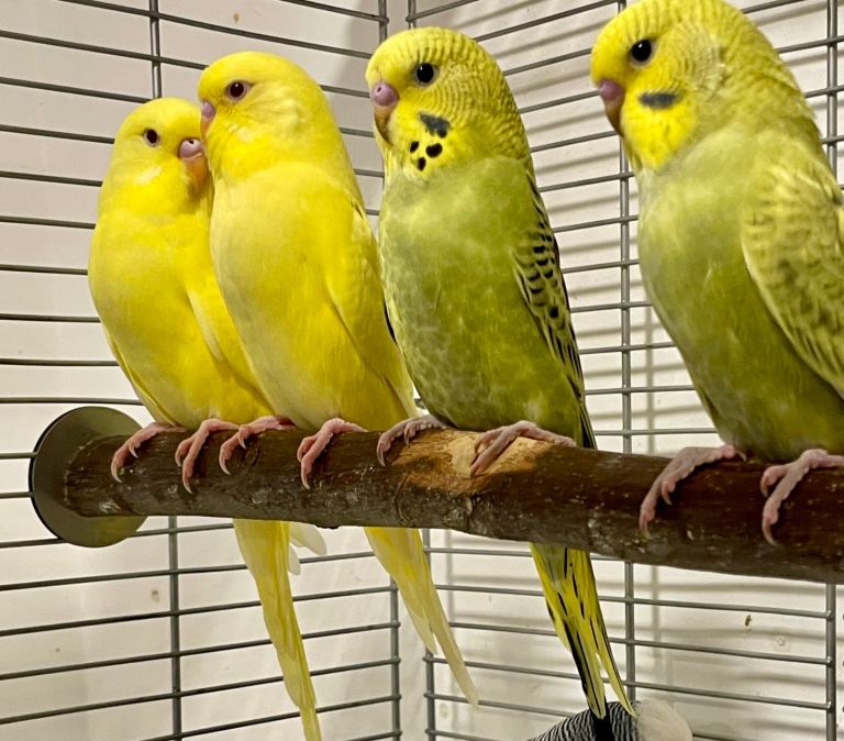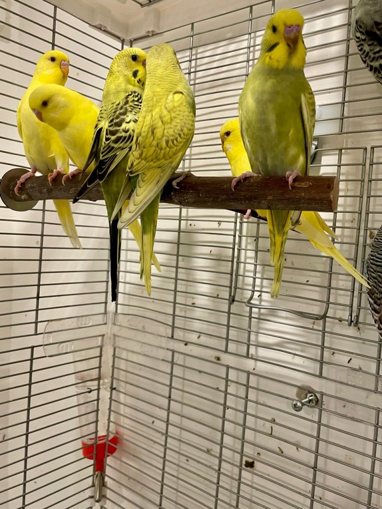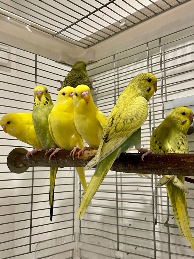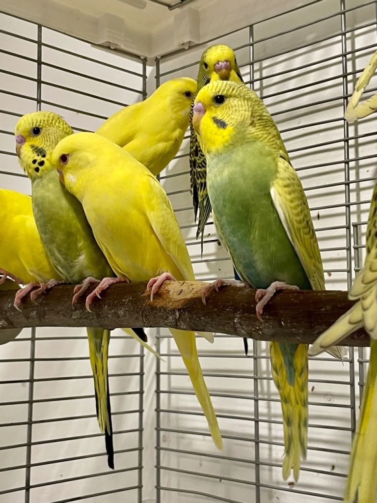 I am selling a group of young budgies, approximately 9 weeks old. All birds are healthy, active, and well cared for in a clean cage environment.