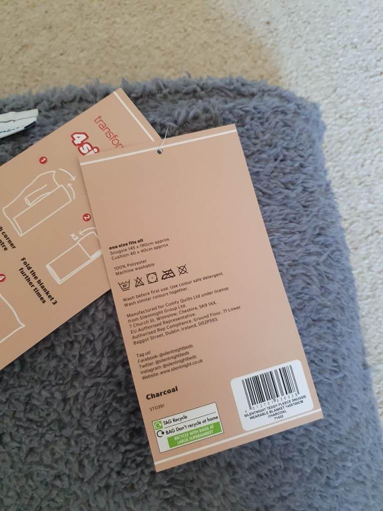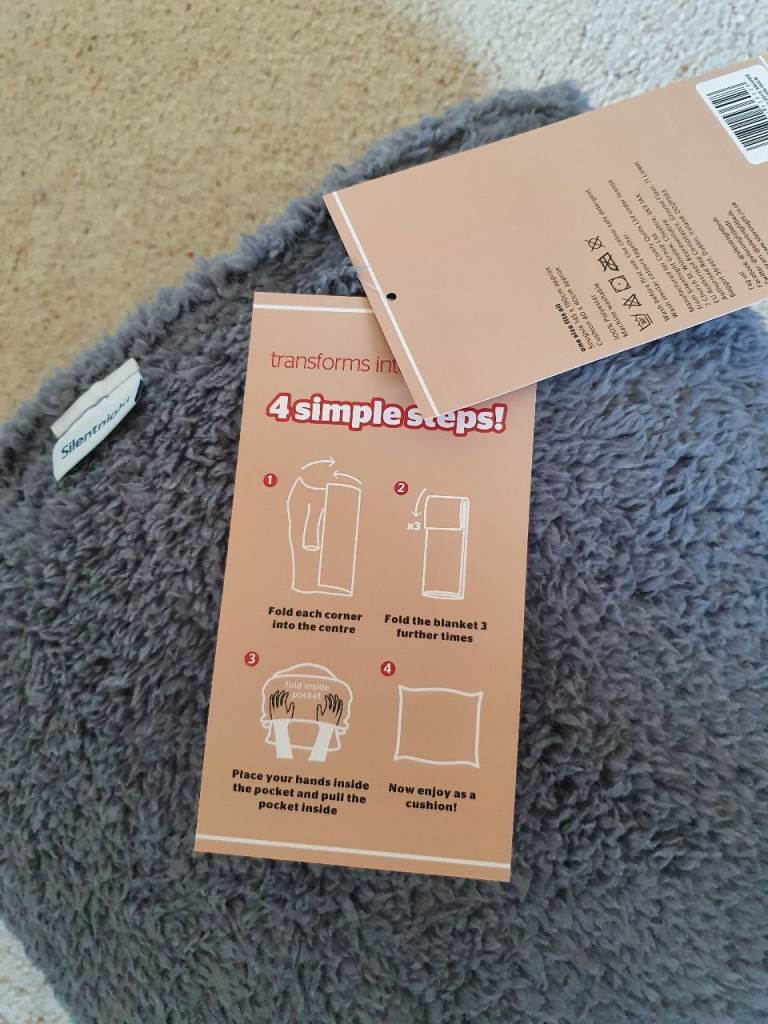 Silent night Snugsie wearable teddy fleece blanket, foot pocket to keep toes warm, sleeves & transforms into a cushion for storage.