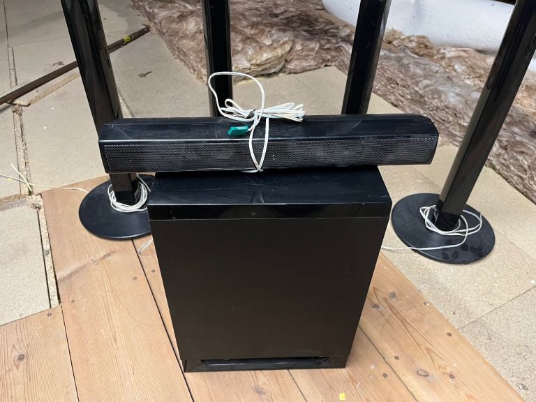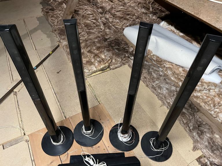 4 speaker towers, sound bar and bass box