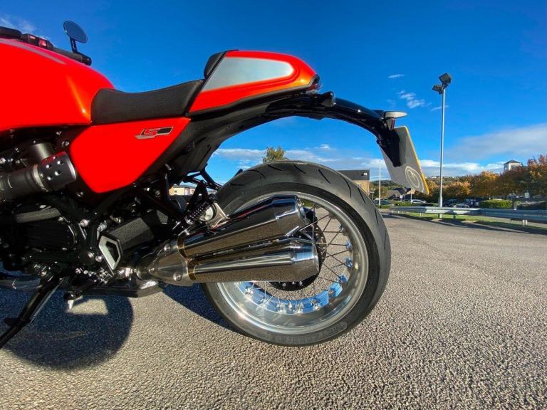 This BMW R 12 S with OPTION 719 billet kit and includes the handlebar-mounted cockpit fairing with the tinted windshield, the seat with contrast stitching, and the Lava orange metallic paint finish.