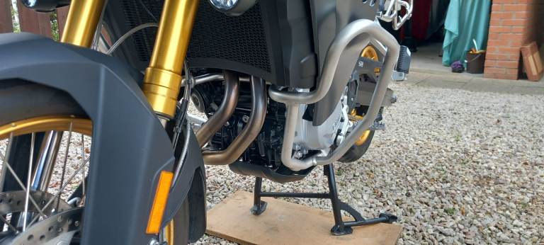 In addition the bike is fitted with the much better and easier to see high level sat nav mount moving it above the TFT screen using the original BMW locking mount and also has a front mudguard extender .