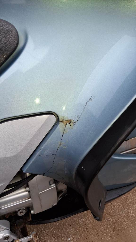 As shown in the photos, there has been some historic minor damage to the right side fairing knee area which has been solidly repaired with hot staples and then filled, and a couple of minor scratches on the left pannier.