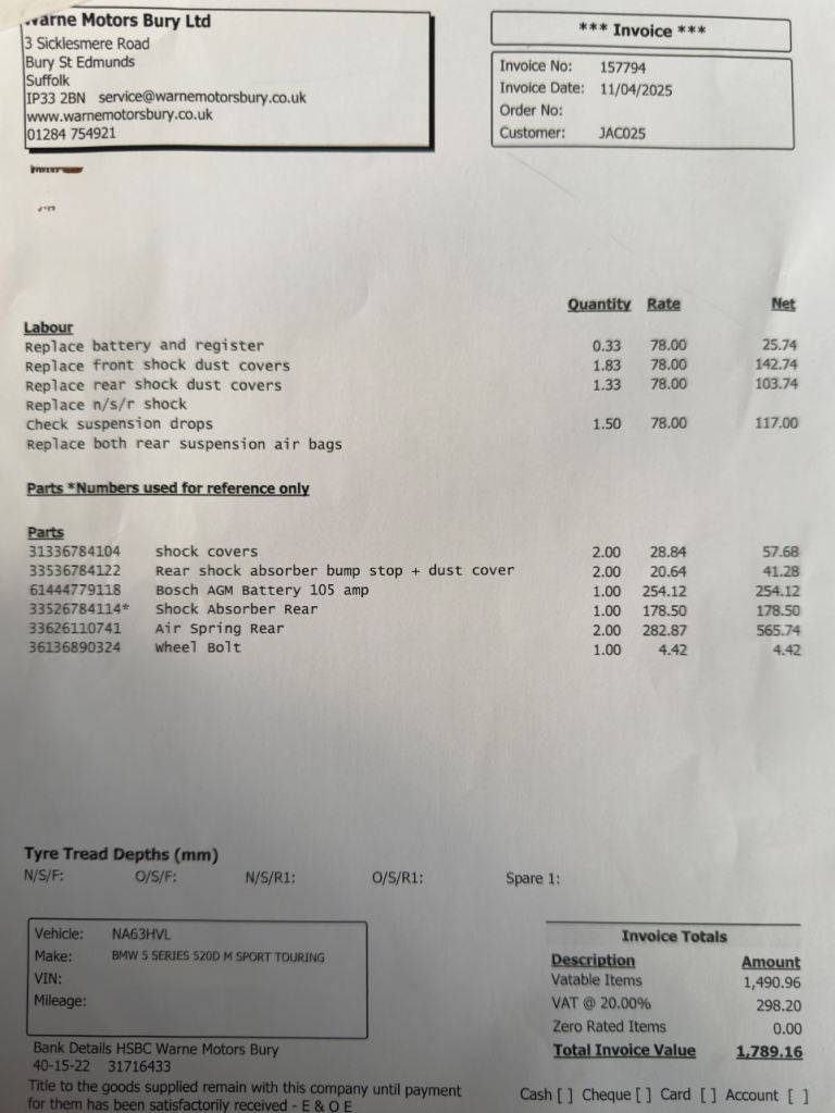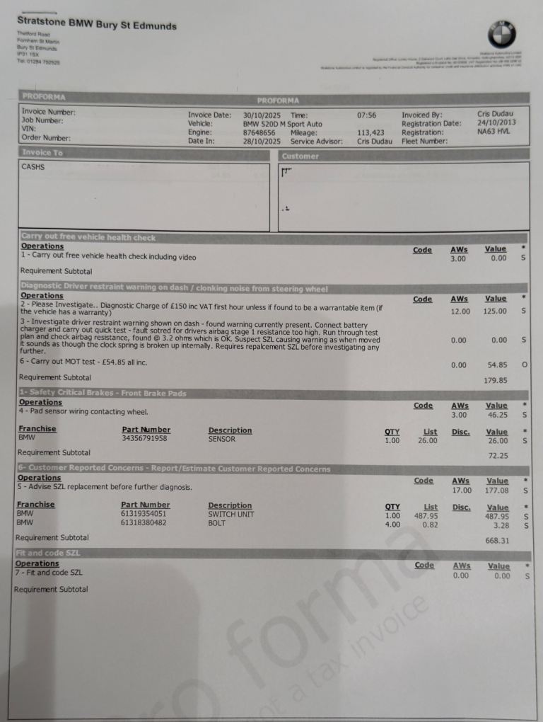 BMW Vehicle Health Check completed on 28/10/25 - New SZL Steering Wheel Switch Unit and new Brake Pad Sensor fitted at BMW. £1100 of work was carried out.
