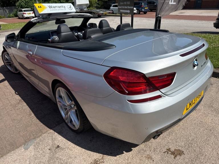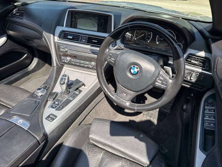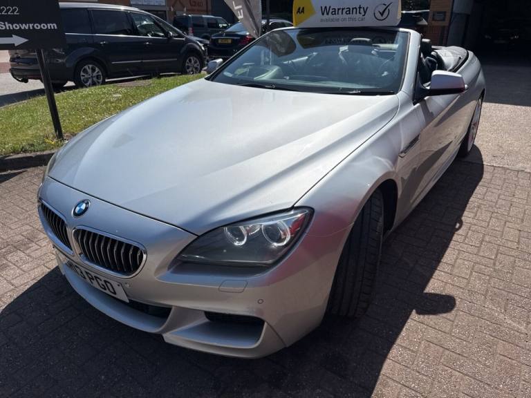 stunning 2013 BMW 6 Series 640d M Sport Convertible, finished in sleek metallic silver and powered by a powerful yet efficient 3.0-litre diesel engine. This 8-speed automatic grand tourer delivers an impressive blend of luxury, performance, and economy, returning up to 50 miles per gallon and costing just £215 per year in road tax. This particular example has had just one previous owner and has been meticulously maintained throughout its life. The car comes with an MOT valid until January 2026 with no advisories, giving you peace of mind and confidence in its condition and reliability. It drives beautifully with smooth gear changes, responsive handling, and a refined ride - perfect for top-down motoring or long-distance cruising. The M Sport trim enhances the cars dynamic appeal, with a sportier body styling, upgraded alloy wheels, and a well-appointed interior featuring premium materials, sports seats, and BMWs iDrive infotainment system. This convertible is not only about looks - its built to deliver performance and comfort in equal measure, with the 3.0-litre twin-turbo diesel engine offering both low-end torque and high-speed refinement. Whether youre after a stylish weekend cruiser or a practical daily driver with a touch of class, this BMW 640d M Sport Convertible ticks all the boxes. Viewing is highly recommended to fully appreciate the quality and presence of this exceptional vehicle..12V Power Socket - Front x2, 19in Alloy Wheels - Light M Double Spoke Style - 351M, ABS - Anti Lock Braking System, ASC - Automatic Stability Control, Air Conditioning - Automatic with Two-Zone Control, Airbags - Driver, Airbags - Front Side, Airbags - Passenger, Airbags - Passenger Deactivation, Alarm System Thatcham 1 with Remote Control, Ambient Interior Lighting, Armrest - Front with Storage Compartment, Automatically Dimming Rear View Mirror, Auxiliary Input, BMW Assist, BMW Assist Online Portal, BMW Online services, BMW Professional Radio - Single CD and MP3, BMW TeleServices, Battery in Luggage Compartment, Black Panel Display, Bluetooth Hands Free with USB Audio Interface, Brake Callipers - Black - Front and Rear, Brake Pad Wear Indicator - Front and Rear, Brake Pre-Tensioning, Bumper - Rear Dark Chrome Insert, CBC - Cornering Brake Control, Check Control Warning System, Child Seat ISOFIX Attachment - Rear x2, Contrast Stitching, Control Display - 10.2in Colour Display, Courtesy Lights - Front with Soft On-Off Dimming, Crash Sensor, Crash Sensor - Activating Central Locking-Hazard Warning Lights-Fuel Cut Off, Cruise Control with Brake Function, Cup Holders - Two - Centre Console, DAB Digital Radio, DBC - Dynamic Brake Control, DSC - Dynamic Stability Control Plus, DTC - Dynamic Traction Control, Daytime Running Lights, Deformation Zones - Front and Rear, Door Mirrors - Body Coloured Housing, Door Mirrors - Folding - Automatically Dimming - Aspheric - Heated - Electric Adjustment, Door Sill Finishers - BMW Designation - Chrome Plated - Illuminated, Drive Performance Control - ECO PRO - Comfort - Sport - Sport Plus, Dynamic Brake Lights, EBD - Electronic Brake-Force Distribution, Electric Windows - Front and Rear with Open-Close Fingertip Control, Electro Mechanical Parking Brake, Engine Immobiliser, Enhanced Bluetooth Telephone Functionality with Telematics, Exhaust Tailpipes - Dark Chrome, Exterior Parts in Body Colour - Bumpers - Door Handles - Mirror Caps - Roof Mouldings, Exterior Trim - High-Gloss Shadowline, First Aid Kit, Floor Mats - Velour, Fogging Sensor - Front Windscreen, Footwell Lights - Front, Head Restraints - Front Anti-Whiplash, Headlights - Automatic Activation, Headlights - Washer System, Headlining - Anthracite, Heated Windscreen Washer Jets, Hill Start Assist, Instrument Panel - Leather, Interior Trim - Aluminium Hexagon, Keyless Start, Kidney Grille - Chrome with Chrome Fronted and Black Sided Vertical Slats, LED Fog Lights -