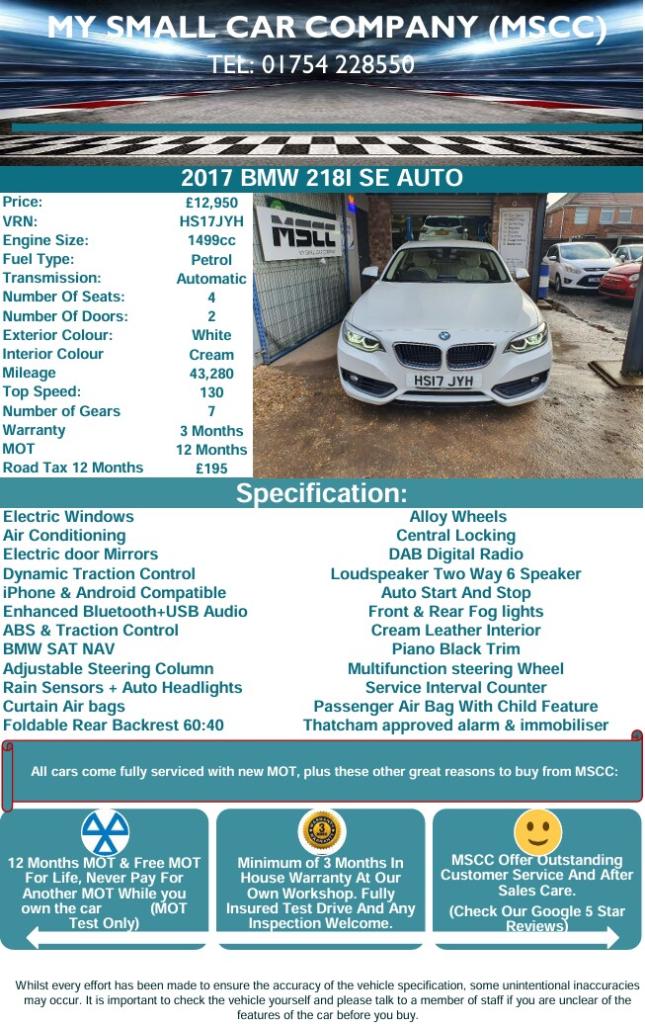 2017 BMW 218I SE AUTOMATICThis 218i Automatic is simply in fantastic condition with only 43,280 miles from new. As expected it drives perfectly. It has DAB Radio, Cream Leather interior, BMW idrive with Navigation to name a few of its extras. This car comes with a 3 month or 3000-mile warranty (extendable), fully serviced and 12 months MOT for a real peace of mind buying experience for £12950For a test drive and no pressure viewing please pop down to our sales site on Heath Road, Skegness, Lincolnshire, PE25 3STAll MSCC cars are HPI clear unless stated and come with a free MOT for life (Test Only)