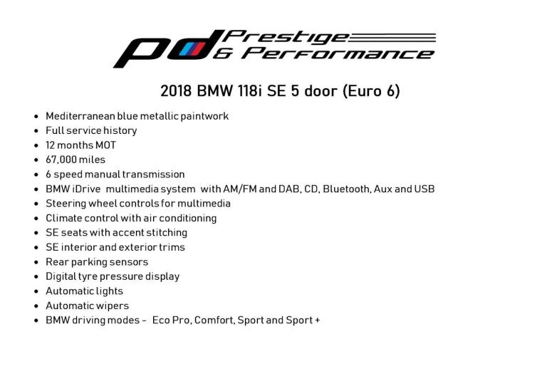 PD Prestige & Performance Ltd are pleased to offer this 2018 BMW 118i SE Euro 6, Extremely good exterior and interior. Drives outstandingly. All vehicles will come with a 3-month warranty *Extended warranty package available at cost price* A small deposit of 250 will secure this vehicle for 7 days, this will remove the car from sale on all platforms. We offer delivery at a small cost and contactless pick up if needed. We are also a German vehicle specialist garage carrying out all aspects of maintenance and repair with over 30 years combined experience and have been in business for over 20+ years. All vehicles have an 100-point inspection and will come with at least 9 months remaining on the MOT., All vehicles have been serviced within the last 12 months before purchase. PD Prestige & Performance Ltd are open 7 days a week and run on an appointment only basis *Please message, email, or Whatsapp/call [Phone number removed] to book* We accept bank transfer and cash. We accept part ex, please note we only offer trade value for part exchange vehicles. Buying a car should not be a stressful experience and here at PD Prestige & Performance Ltd we are here to make the process as smooth as possible for our customers. We pride ourselves with on customer service and being a one stop shop taking care of our customers going forward with our in-depth mechanical knowledge with full state of the art workshop facilities. *All deposits are non-refundable unless a fault is found with the vehicle, this deposit is then taken of the sale price of vehicle when purchased*