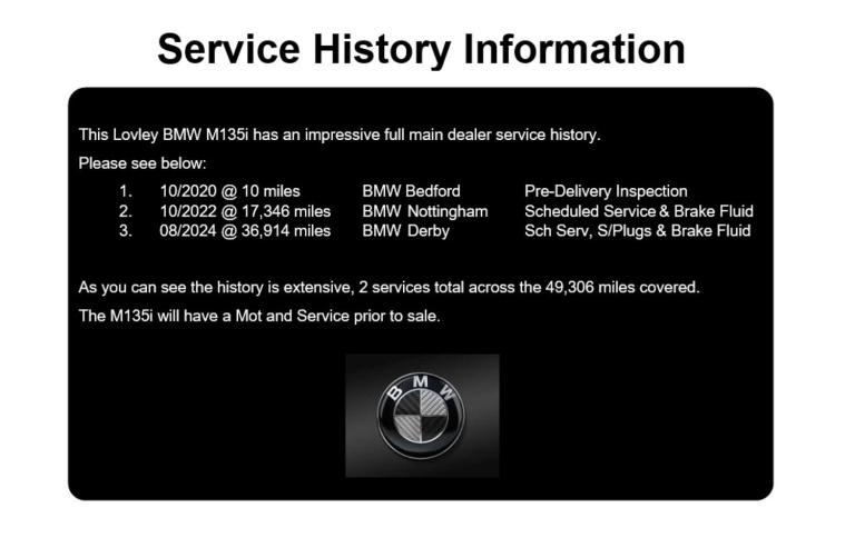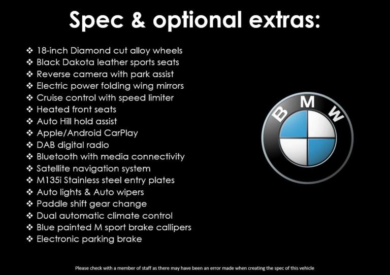 We are pleased to offer this stunning BMW M135i XDrive finished in Melbourne Red metallic. Powered by a 2 litre turbocharged petrol engine producing 301 bhp with an automatic 8 speed gearbox. This vehicle also has 2 previous owners and comes with 2 keys and full service history. Included with the sale is 6 months premium warranty, 12 months MOT, 12 months breakdown cover & a fresh service. We offer very competitive £0 deposit finance options starting at 8.9% with Evolution Funding. We accept all part exchanges and offer FREE delivery up to 100 miles in our Brian James enclosed trailer.The spec on this vehicle is; 18-inch Diamond cut alloy wheels, Black Dakota leather sports seats, Reverse camera with park assist, Electric power folding wing mirrors, Cruise control with speed limiter, Heated front seats, Auto Hill hold assist, Apple/Android CarPlay, DAB digital radio, Bluetooth with media connectivity, Satellite navigation system, M135i Stainless steel entry plates, Auto lights & Auto wipers, Paddle shift gear change, Dual automatic climate control, Blue painted M sport brake callipers, Electronic parking brake.If you have any questions please do not hesitate to contact us! Thanks for viewing.