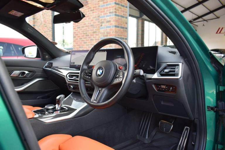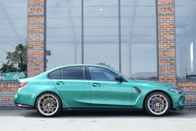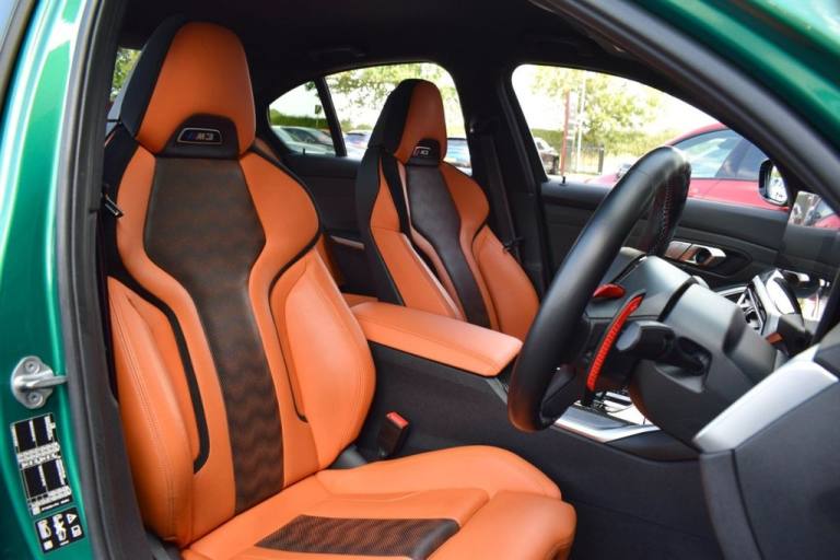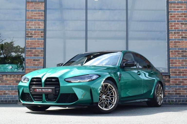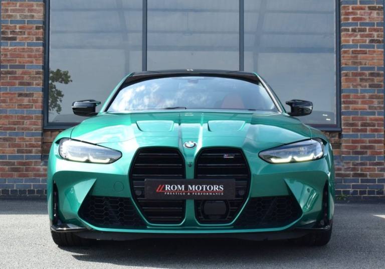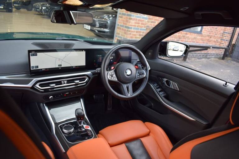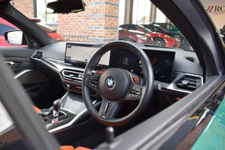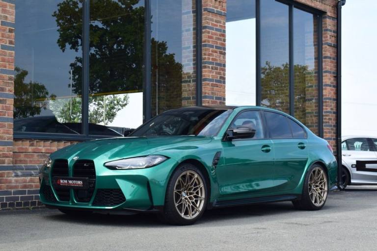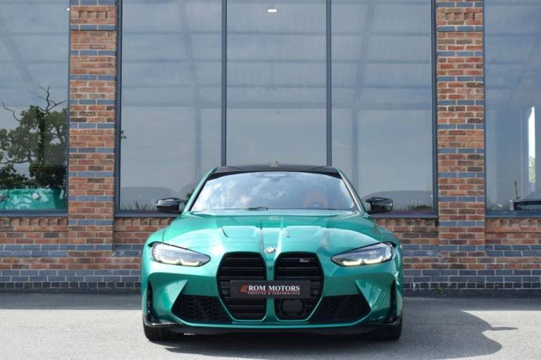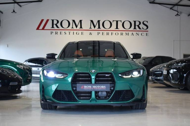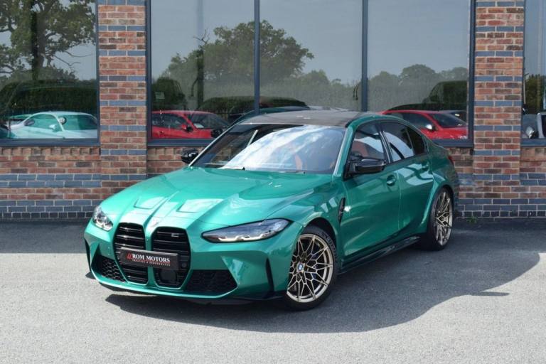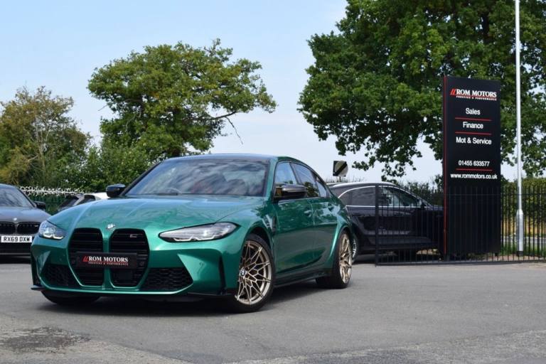 Rom Motors are delighted to present this stunning example of a BMW M3 Competition for sale. Finished in the ever so desirable Isle of Man Green metallic with contrasting Kyalami Orange Merino leather interior. On the outside it features the staggered 826M Forged alloy wheels finished in satin bronze which works ever so well with the colour combination! The car also benefits from a few of the desirable factory options such as the heated steering wheel, comfort package (keyless entry and electric boot lid) and technology plus package (area view camera, Drive Recorder and active cruise control). One owner from new, with full BMW service history, and a stunning colour combination makes this not one to miss! PAYMENT: We accept debit cards for payments up to £500. For larger payments we accept BACS (bank transfer) only. Please check transfer processing times and limits with your bank if you plan to pay on collection as we are unable to release cars without cleared funds. Please also bring anything you may need to access your online banking on the day including securekeys, card readers etc. Please note a £249 admin fee is applicable for purchases funded by third party finance lenders. 10.9% APR Finance Available along side a wide range of lenders. *Appointment Only* Please call ahead to arrange a viewing or test drive with a member of our friendly sales team. All our vehicles are HPI Clear & prepared to a high standard following a full pre-delivery inspection from our in house team of technicans. 3 Months Warranty is included on all vehicle with extensions available up to 36 months, ask our sales team for more details. Videos available on request. PAYMENT: We accept debit cards for payments up to £500. For larger payments we accept BACS (bank transfer) only. Please check transfer processing times and limits with your bank if you plan to pay on collection as we are unable to release cars without cleared funds. Please also bring anything you may need to access your online banking on the day including securekeys, card readers etc. Please note a £249 admin fee is applicable for purchases funded by third party finance lenders. Call 01455 633577 or WhatsApp 07870 606040.19in Front - 20in Rear Alloy Wheels - M Double Spoke - 826 - Forged - Bicolour Black with Mixed Tyres, 19in Front - 20in Rear Alloy Wheels - M Double Spoke - 826 - Forged - Jet Black with Mixed Tyres, Acoustic Glazing, Active Guard Plus, Air Conditioning - Automatic with Three-Zone, Airbags, Alarm, Ambient Lighting, Armrests, Automatic Start-Stop Button, BMW ConnectedDrive Online Services, BMW Emblem on Engine Compartment Lid and Tailgate, BMW Emergency Call, BMW Individual Lights - Shadowline, BMW Kidney - Frameless with Horizontal Double Grille Slates - Black High-Gloss with Model Badge, BMW Live Cockpit Professional, BMW TeleServices, Battery in Luggage Compartment, Bumper System, Centre Armrest in Rear - Folding with 2 Cup Holders, Centre Lock Switch, Closing System with Central Locking, Condition Based Service, Connected Package Professional, Crash Sensor, Cruise Control including Speed Limiting Function - LIM Button, Cupholder, DAB Digital Radio, DSC - Dynamic Stability Control Plus, Door Sill Finishers with Aluminium Inserts and Model Inscriptions, Door Sill Strips - M Sport Entry Sills, Double-Jointed Spring-Strut Front Axle, Driving Assistant, Driving Experience Switch, Electric Memory Seats, Electric Vehicle Immobiliser, Electric Window, Electro Mechanical Parking Brake, Electronic Differential Lock, Enhanced Bluetooth and Wireless Charging, Extended Storage, Exterior Mirror Caps and Rear Spoiler in High-Gloss Black, Exterior Trim - Extended High Gloss Shadowline, Exterior Trim - High-Gloss Shadowline, Floor Mats - Velour, Folding Wing Mirrors with Auto-Dimming, Follow-Me-Home Function, Front Lumbar Support, Front and Rear Apron Plastic in Body Colour, Galvanic Controls, Glove Compartment - Illuminated, Harman Kardon Surround Audio Sound System, Head-Up Display, Headlight Beam-Throw Control, Headlining - Anthracite, Heat Protection - Sun Protection Glazing, Heated Seats - Front, High-Beam Assistant, Illuminated Bow-Type Door Handles - in Body Colour - Drivers Side with Door Lock, Interior Trim - Black High Gloss, Interior Trim - Carbon Fibre, LED Rear Lights, Language Version English, Lower Edges of Bumpers - Side Sills - Edge Binding of Diffuser and Diffuser in Black High-Gloss, Luggage Compartment Lights, M Adaptive Suspension, M Compound Brakes with Red High Gloss, M Drive, M Drive Professional, M Seat Belts, M Sport Differential, M Sport Seats, M Steering Wheel, Model Badges in Black, Model Logo - Rear Right M3 Competition Inscription, Multif