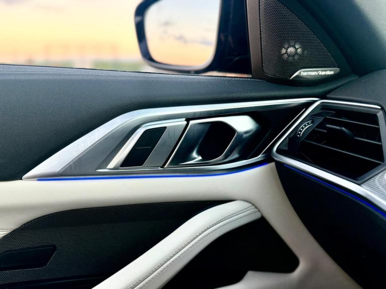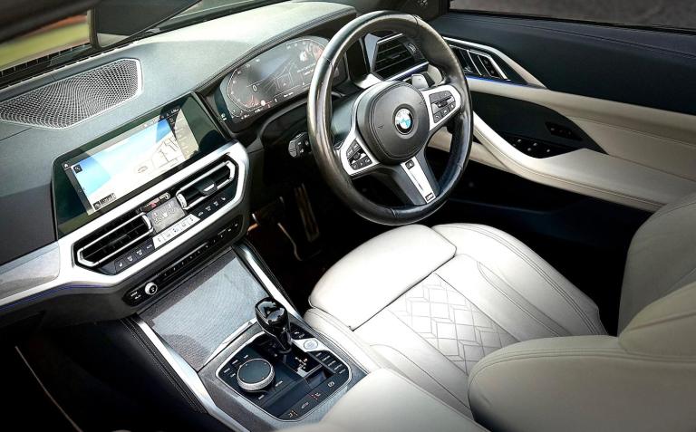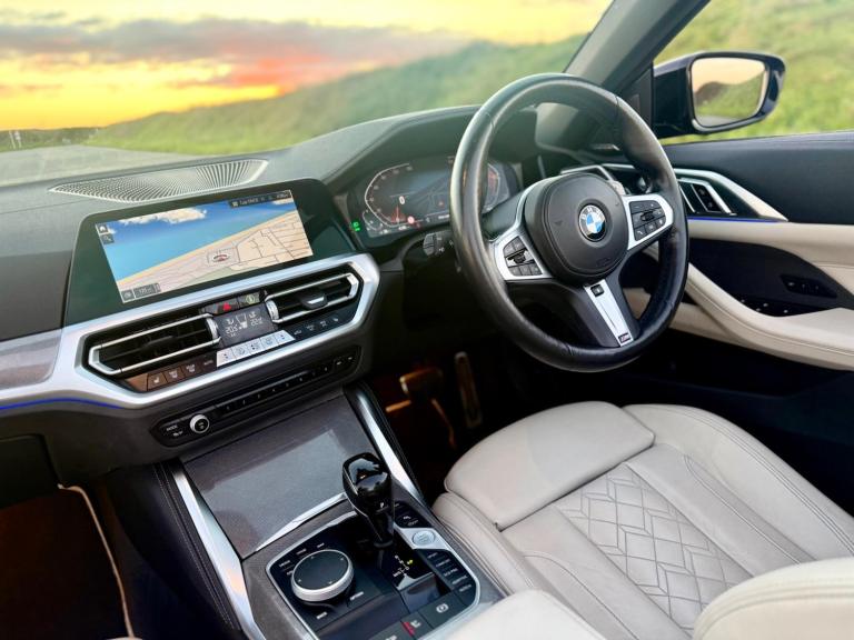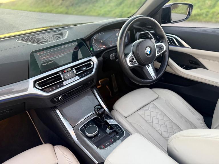 Tanzanite Blue Metallic With Ivory White Extended Merino Leather & Black Stitch, Comfort Pack, Harmon Kardon Premium Sound, Air Scarf Neck Heating, 19''Gloss Black Alloys, Reverse Camera, Front & Rear Parking Assist, Ambient Lighting, Heated Multifunction Steering Wheel, f1 Paddleshift, Voice Command, Adaptive Cruise Control, Digital Virtual Cockpit, Bluetooth, Telephone Prep, Satellite Navigation, Intelligent Safety, Drive Select, Auto Start Stop, Push Button Start, Wireless Charging Pad, three Zone Climate Control, Sports Seats, Heated Seats, Arm Rest With Storage, 1x USB, USBC 2x Rear & One Front, 2x Remote Keys, Beautiful Example With Full Bmw Service History.. This 2022 BMW 4 Series 420i M Sport Pro Edition is a superb example, having been owned by just one careful keeper. It features a responsive 2.0 litre petrol engine and meets Euro 6 emissions standards. The M Sport Pro Edition trim level ensures a sporty aesthetic and driving experience, complemented by a Comfort Package that includes keyless entry and a heated steering wheel for your convenience. You'll also enjoy the premium sound experience of the Harman Kardon loudspeaker system and the practicality of enhanced Bluetooth with wireless phone charging. Bright LED headlights provide excellent visibility, ensuring you can see and be seen.This particular BMW 4 Series stands out with its impressive fuel economy, achieving around 40 miles per gallon, which is a significant advantage for running costs compared to similar vehicles. Furthermore, its low CO2 emissions highlight its efficiency and environmental consideration. Practicality is also a strong point, with generous boot space making it ideal for shopping trips or luggage. These combined highlights demonstrate how this 420i M Sport Pro Edition offers a compelling blend of performance, comfort, and economy.