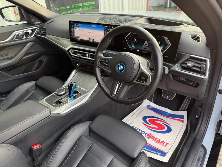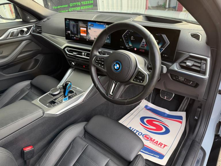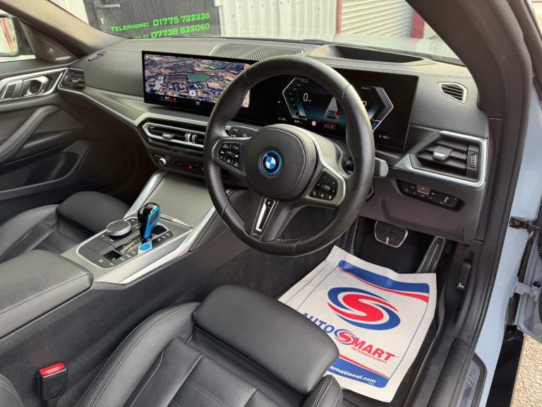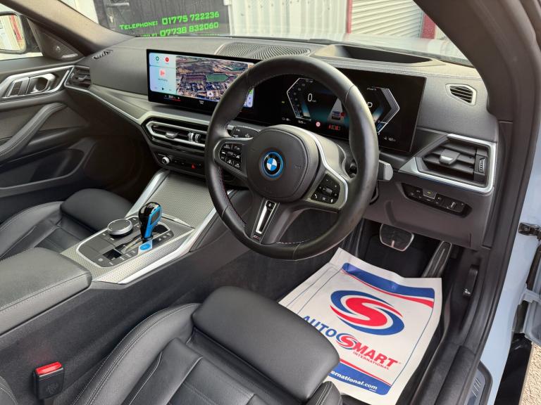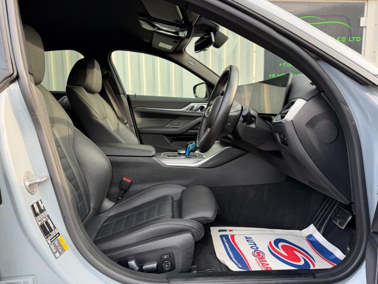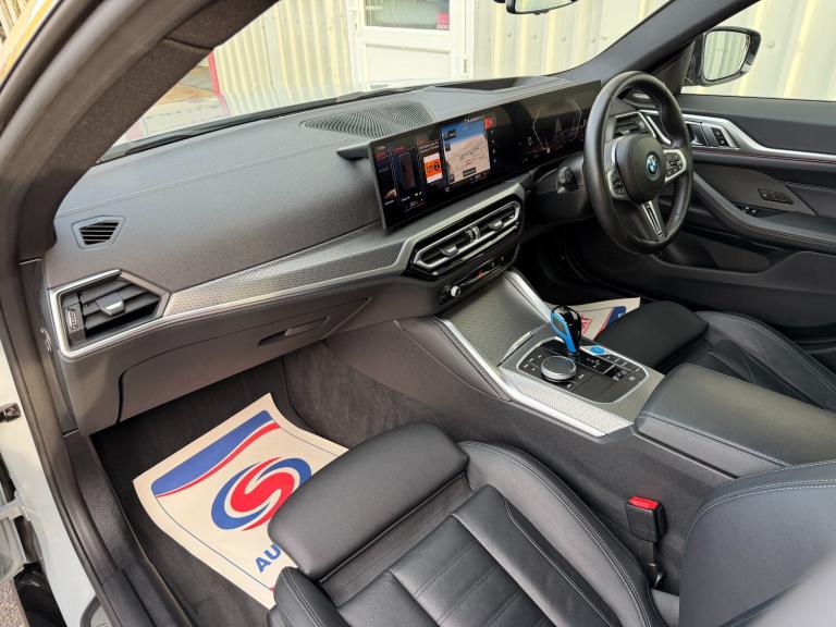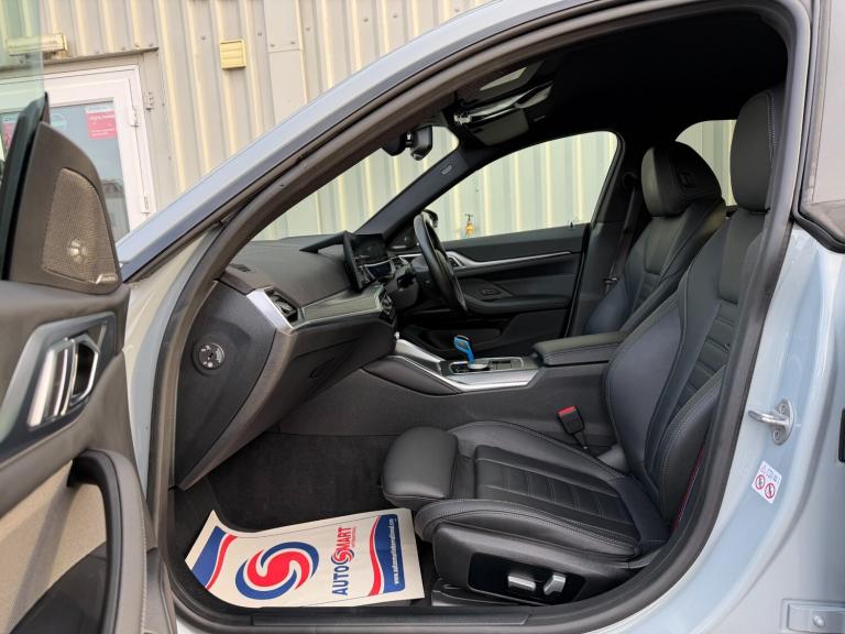The Specification of this BMW i4 Gran Coupe 400kw 84kwh M50 is as follows, Brooklyn Grey Metallic - Black Vernasca Leather Sports Seats with Knee Supports - Electrically Adjustable Drivers & Passengers Seats with Memory - Variable Heated Front Seats - M Seat Belts - Tri Zone Climate Control with Rear Controls & Air Vents - Electric Front & Rear Windows - Electric Folding Mirrors with Auto Dimming Lenses - Wide Screen Live Operating Area Professional - Widescreen Professional Satellite Navigation & Media System - RDS DAB Digital Stereo - USB Interface - Bluetooth Music Streaming - Hard Drive Music - BMW Apps Inc Spotify - Apple CarPlay - Android Auto - Harman Kardon Surround Sound System - Connected Drive Services - Connected Package Professional - Bluetooth Phone - Wireless Charging - Drivers Assistant Professional - Adaptive Cruise Control with Assisted Driving Mode - Active Cruise Control with Distance Control & Assisted Driving Mode - Speed Limiter - Blind Spot Monitors - Active Lane Guidance - Steering & Lane Control Assist - Front Collision Warning - Head Up Display - Virtual Cockpit - Nappa Leather M Sport Multi Function Steering Wheel - BMW Iconic Sound - Rear Centre Armrest Cupholders, 3 Adjustable Rear Head Rests, 3x3 Point Rear Seat Belts, Isofix Child Seat Points to Rear Outer Seats, Split Folding Rear Seats 40/20/40, 3 Pin Charger & Type 2 Cable - BMW I4 Gran Coupe 400KW 84KWH M50 Bodystyling - M Sport Aerodynamics Package - M Sport Pro Front & Rear Bumpers / Rear Diffuser / Side Skirts / Rear Spoiler & Grilles - 19 inch M Sport Double Spoke Alloys finished in Black & Silver 861M - Adaptive Suspension - M Performance Red Calipers - M Shadowline BMW Laserlights with Signature LED Daytime Running Lights - High Beam Assist - Shadow Line Exterior Trim - Reverse Assistant - Park Assist Plus - Self Park - 360 Degree Surround View Cameras with Guidance Lines - 3D Remote View - Privacy Glass, 2 Keys, Full BMW Service History, 12M MOT, 6 Months Comprehensive Platinum Plus Warranty. Factory Fitted Options include: Vernasca Leather - Black with Grey Stitching, Electrically Adjustable Seats with Drivers Memory Facility, Front Lumbar Support, Steering Wheel - Heated, Comfort Pack, Tech Plus Pack, Driving Assistant Professional, Adaptive Cruise Control with Assisted Driving Mode, Active Cruise Control with Assisted Driving Mode, Blind Spot Monitors, Lane Keeping Assistant with Active Side Collision Protection, Steering and Lane Control Assistant, Crossing Traffic Warning Front, Crossroads Warning and City Braking Function, Evasion Aid, Wrong Way Warning, Driver Recorder, Head Up Display, Wireless Charging, Visibility Pack, BMW Laserlights, Adaptive High Beam Assist, High-Gloss Shadowline with Extended Contents, Parking Assistant Plus, 360 Degree Surround View Cameras with Guidance Lines - 3D Remote View Via My BMW App