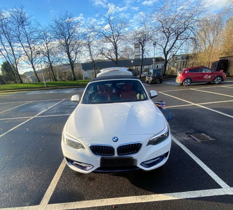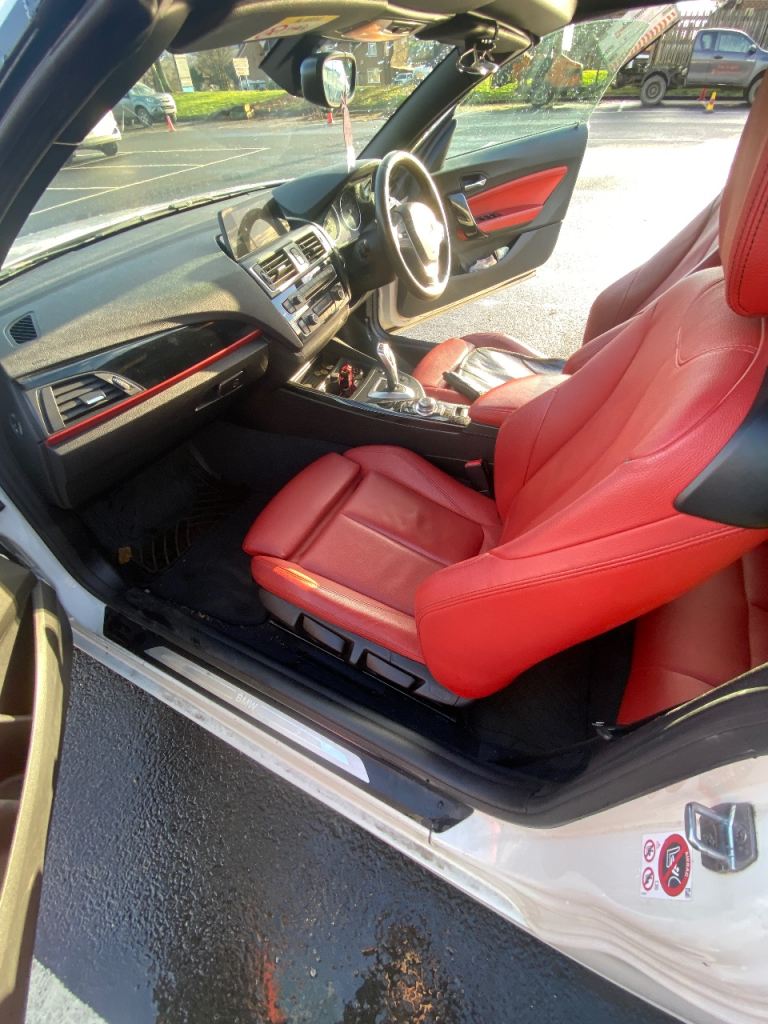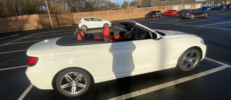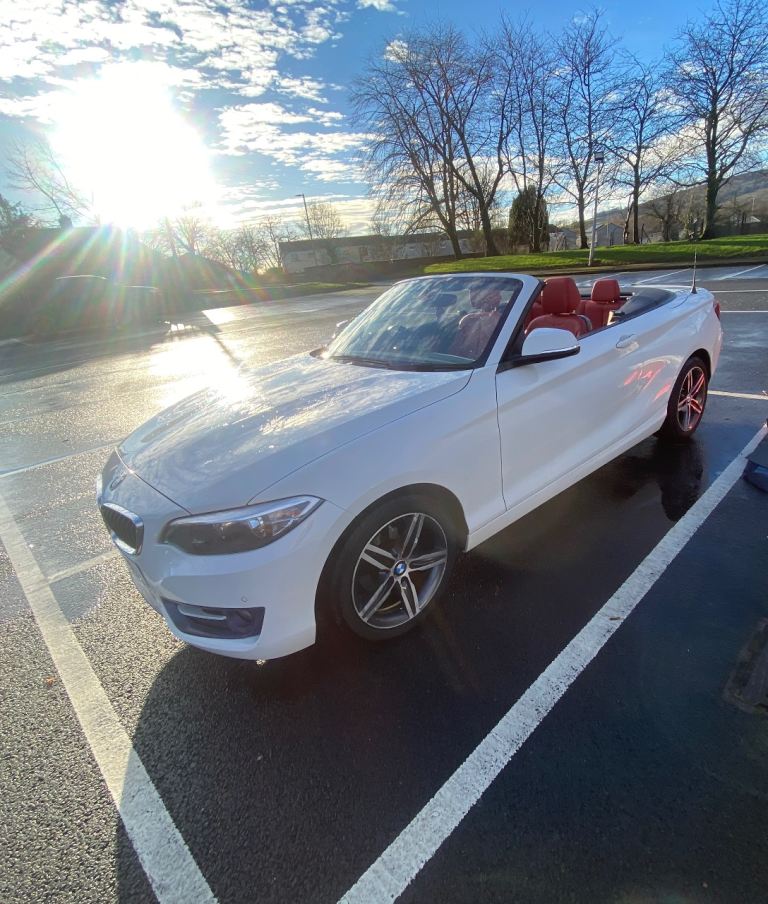 Very smart BMW 2 Series 218i Sport Convertible, finished in white with red leather interior. Smooth automatic gearbox, low mileage for the year, and a great specification. Drives exactly as it should.