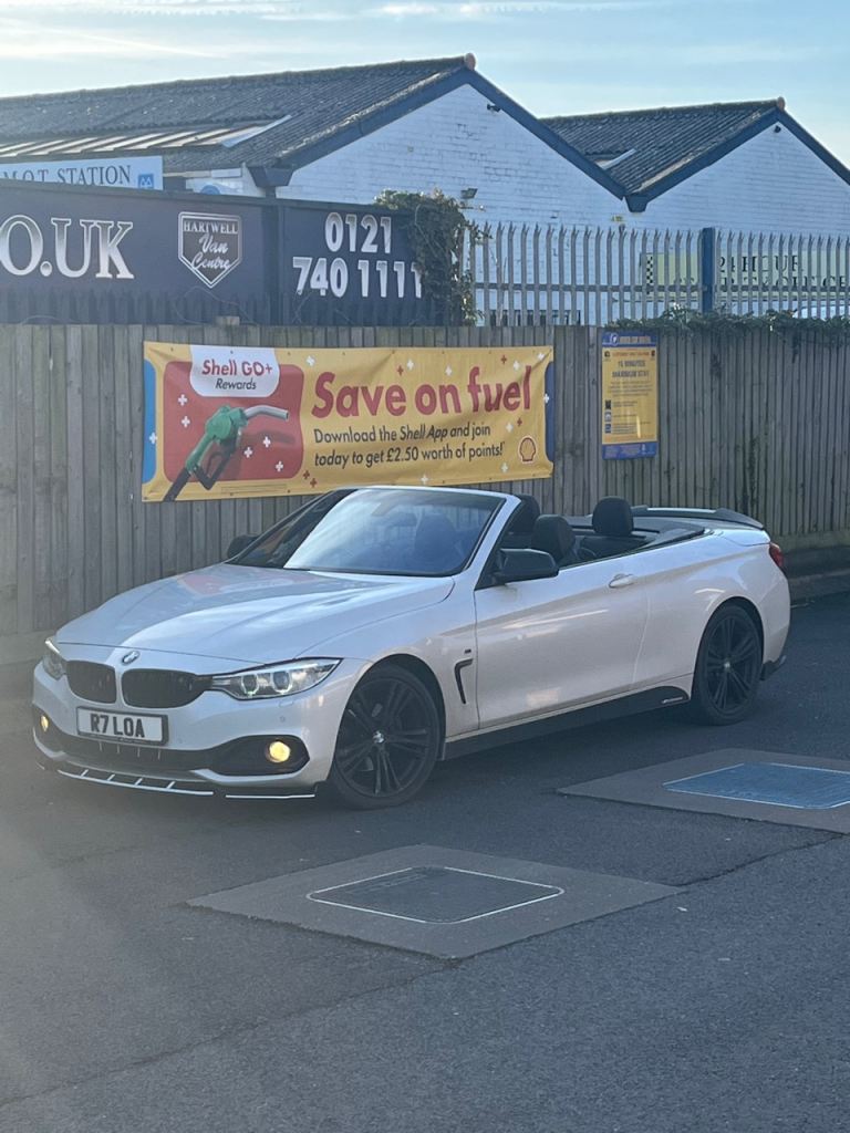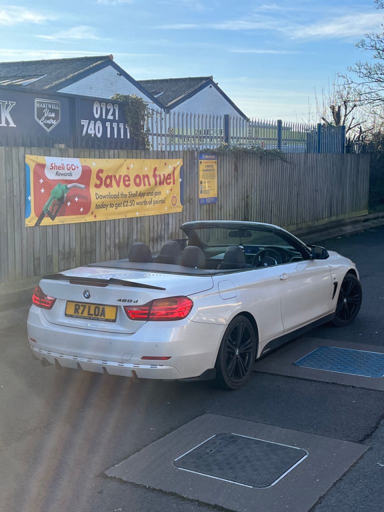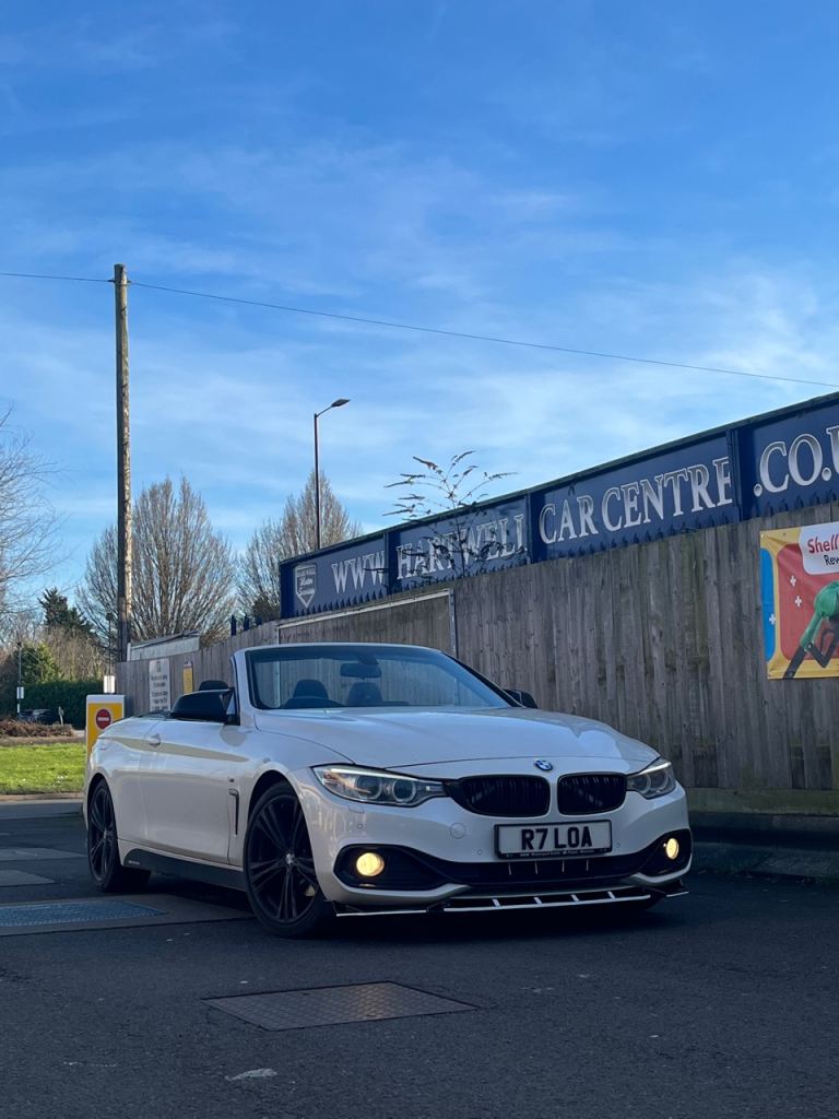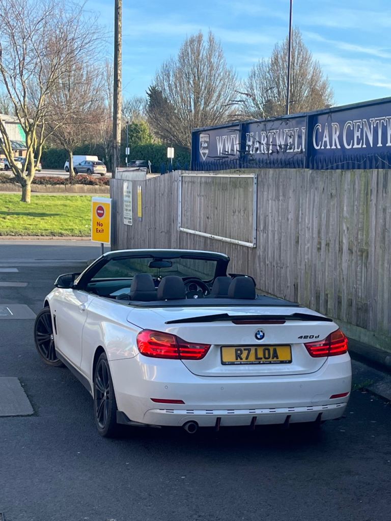 BMW 420d SPORTS CONVERTIBLE ULEZ FREE COMES WITH PRIVATE REG PROPER HEAD TURNER GET READY TO RUMBLE FOR SUMMER FULL BMW SERVICE HISTORY LOW MILLEGE ONLY 110k 360 PARKING SENSORS DRL AUTO LIGHTS ANGEL EYES ALPINE WHITE ELECTRIC HARDTOP WORKS FANTASTIC HEATED ELECTRIC ALCANTARA LEATHER ALCANTARA STEERING ONBOARD COMPUTER MULTIFUNCTION STERRING 19” M SPORTS ALLOYS M SPORTS BADGES DRIVES ABSOLUTELY FANTASTIC IN DAILY USE BERN ALL OVER THE COUNTRY IN IT VERY CHEAP ON DIESEL UNLIKE THE AUTOMATIC ESPECIALLY WITH FUEL PRICES RISING THIS CAR GIVES ME 80+ MILES LOCAL RUN WITHIN THE TRAFFIC FOR £20.00 FUEL MORE ECONOMICAL ON THE MOTORWAY COMES WITH DVD SATNAV USB BLUTOOTH AUX RADIO BRILLIANT SOUND SYSTEM CUPHOLDERS ARMREST M SPORTS SIDE FOOT LIGHTS AUTO DOOR HANDLE CRYSTAL LIGHTS AUTO REAR LIGHTS FULLY LOADED CHEAPEST IN THE COUNTRY CHEAPEST 4 SERIES CONVERTIBLE IN THE COUNTRY ABSOLUTE BARGAIN