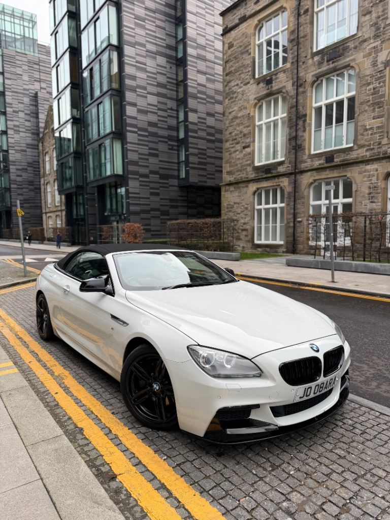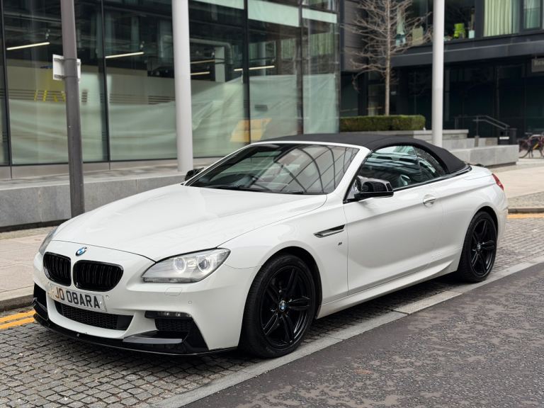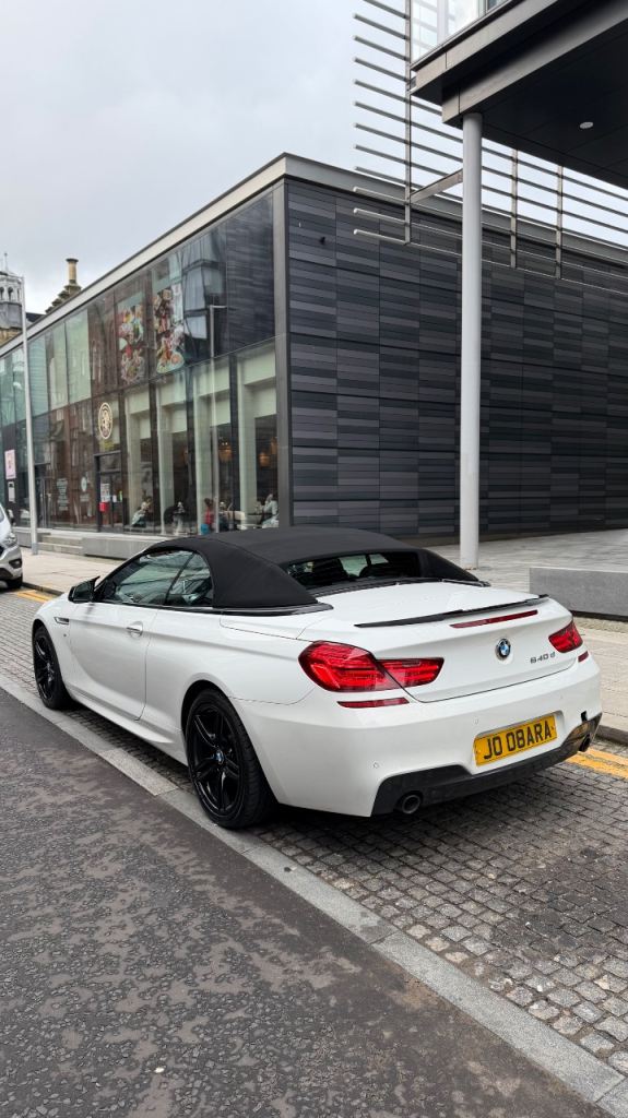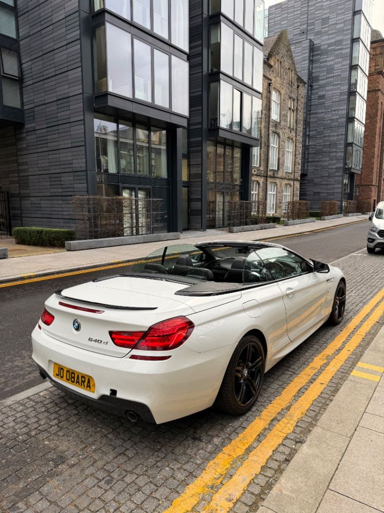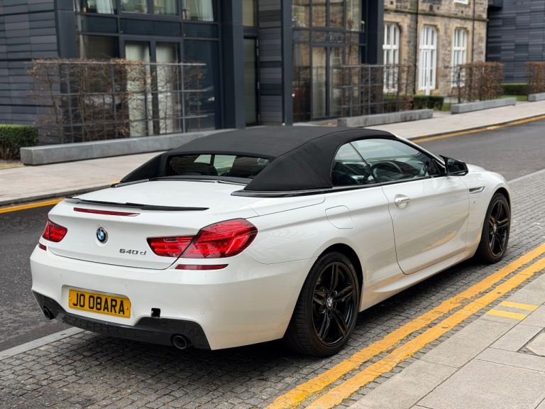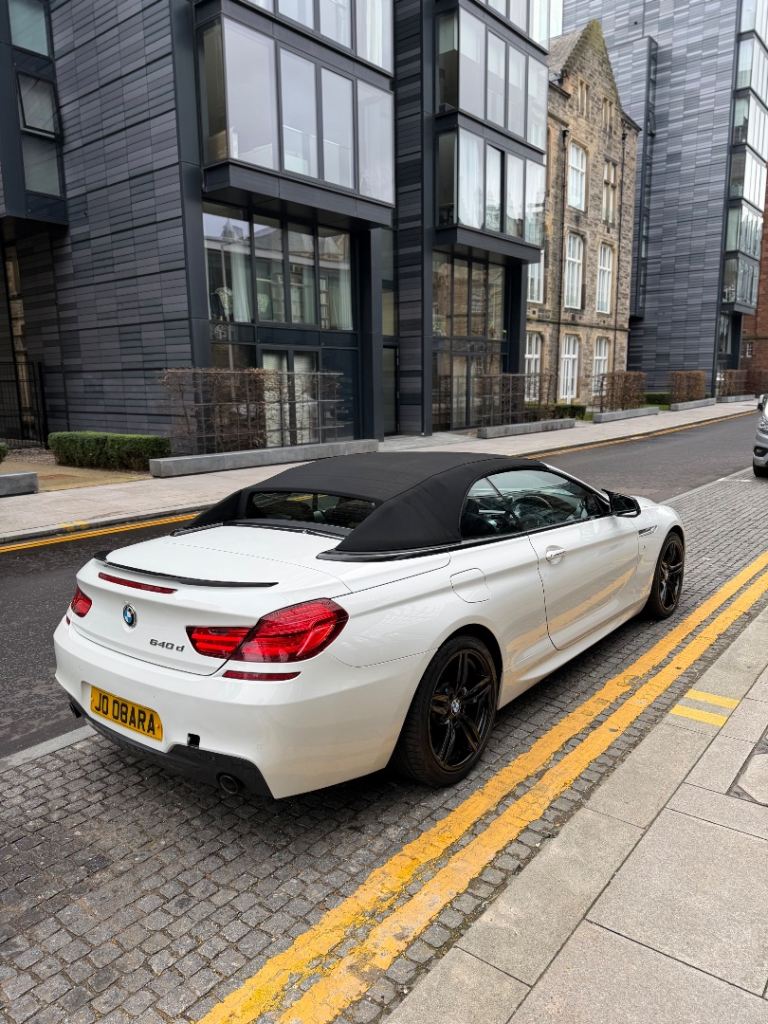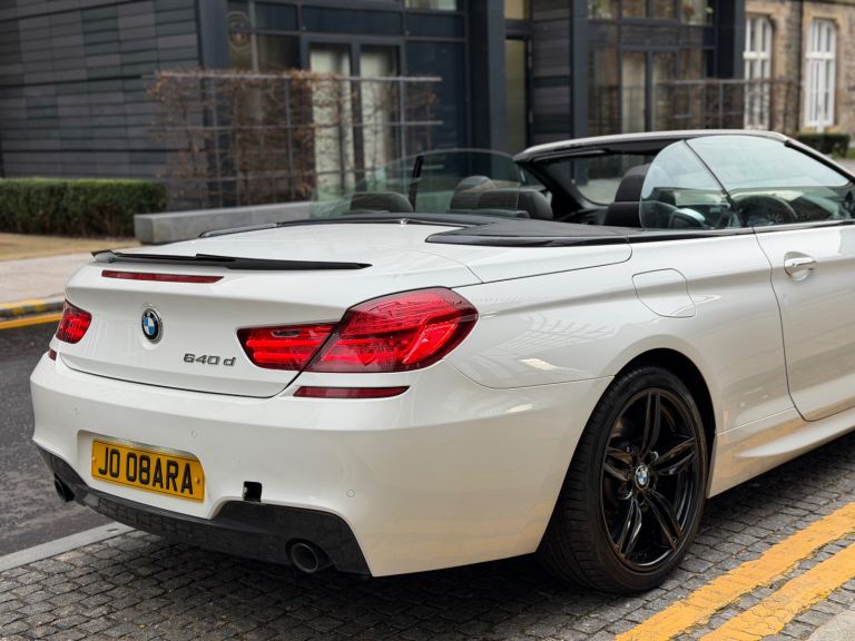 3.0L 640d M Sport Convertible Diesel Auto 8 Speed Euro 5b (s/s) (313 ps) Twin-Power Turbo model, The car is finished in Alpine White with contrasting Black M Sport alloys and a black leather interior. It has been exceptionally well-maintained and drives perfectly. No warning lights on the dash. The soft-top roof operates smoothly and is in great condition. The paintwork is in excellent condition and has a deep shine. There is one very minor dent on the driver's door, but otherwise, the car is beautiful