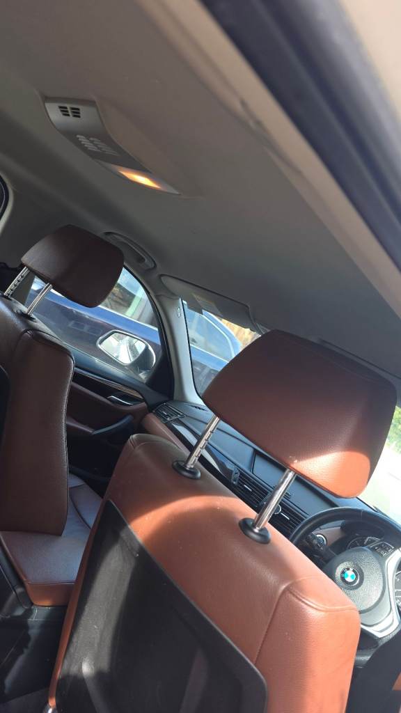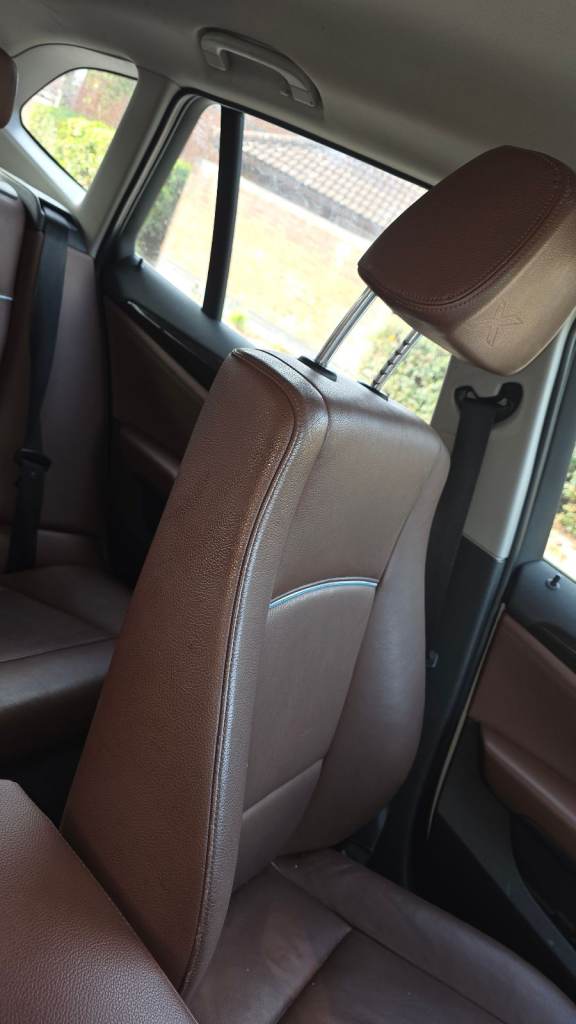 The interior features brown leather xLine, which is enhanced by blue stitching on the brown leather seats.