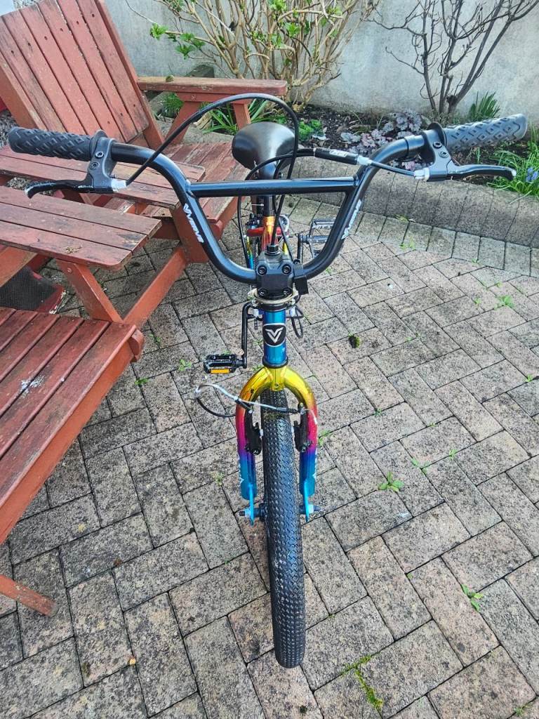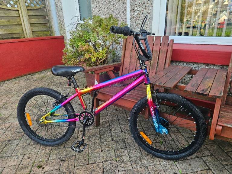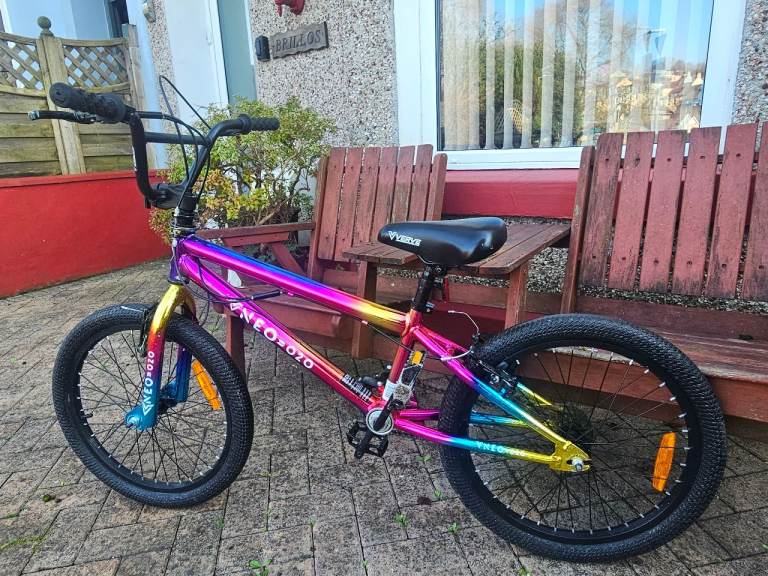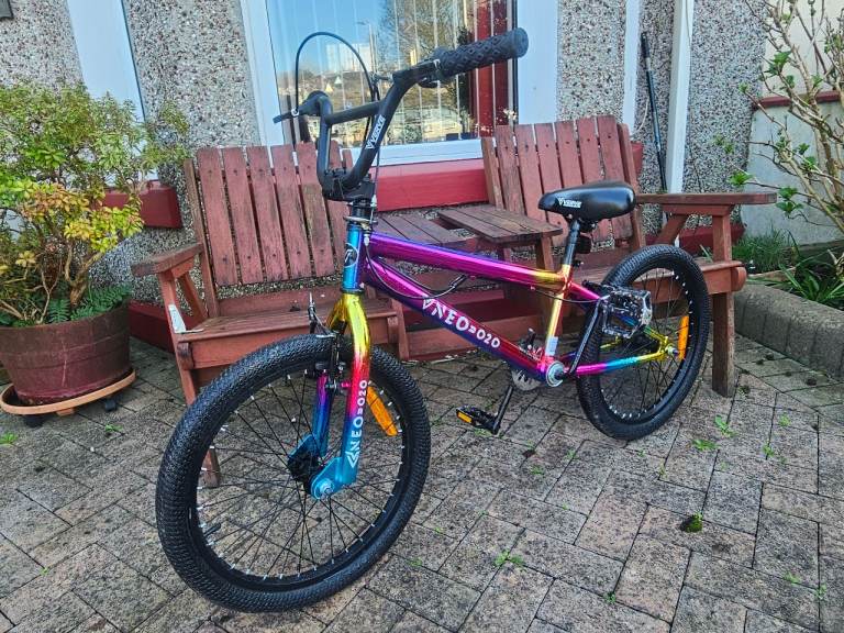 This 20 Inch Wheel Verve Neo Chrome BMX Bike has a vacuum coating with a neo-chrome finish, creating a vibrant reflective multi-colour effect, with a translucent chain guard and metallic gold details.