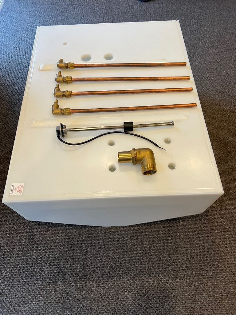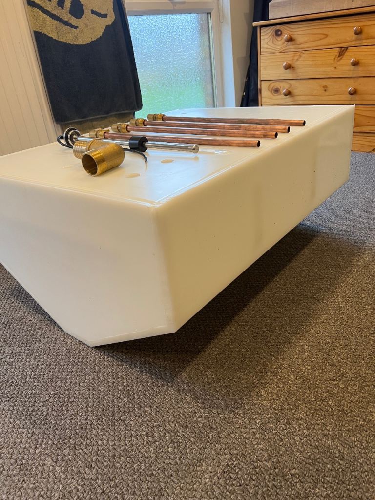 Was for a project that got cancelled. Comes with 2 send and 2 returns, with Wema fuel level sensor, fill and vent. Manufactured from 12mm diesel resistant plastic, baffled sections. Super strong and designed to sit in bottom of hull. Never installed, and unused. Hydrostatically tested. Cost new would be circa £1300 with connections and sensor. Perfect for project. Collection only as it is heavy, it is manufactured to withstand the elements at sea. Sensible offers considered