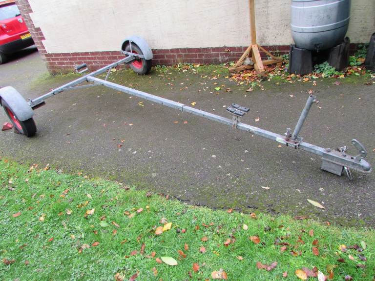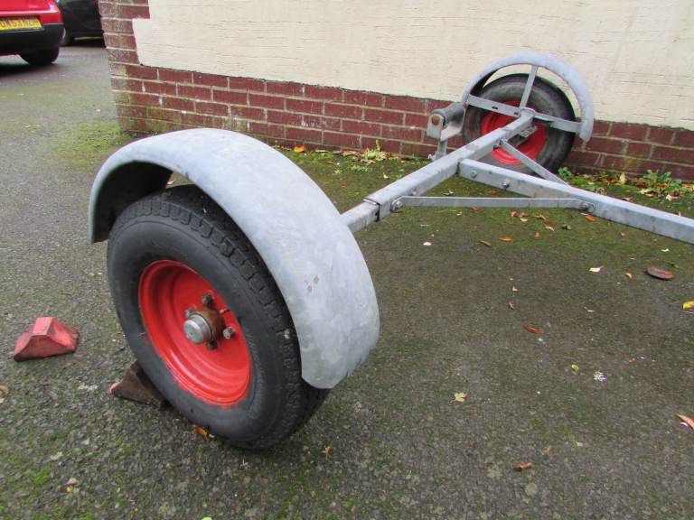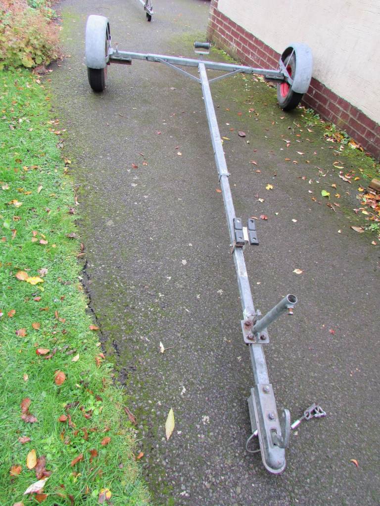Galvanised, 10ft long, adjustable for length and width. 10" wheels, smooth bearings, rear roller, front keel pad. mast support if req. Suspension units appear to be quite recent. Could be converted to trailer with side support or cradle. Poss. delivery