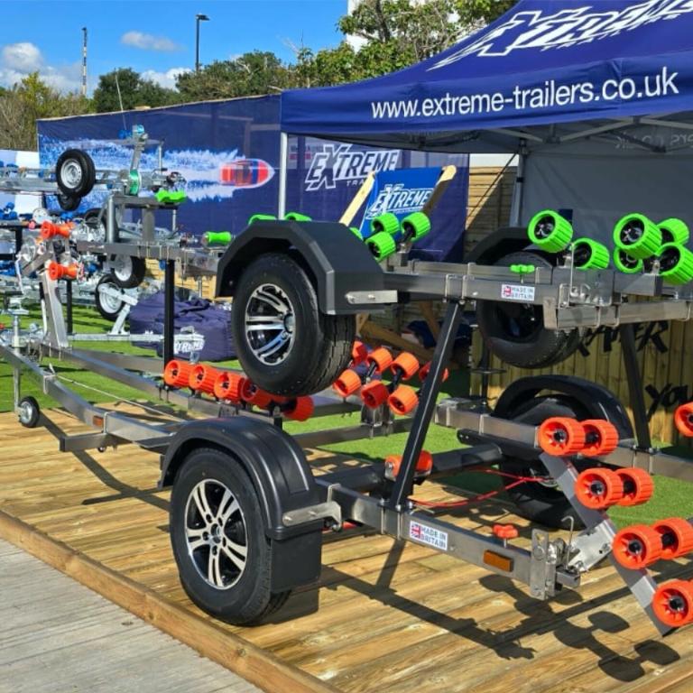 This model advertised is the Extreme twin Jetski 1300KG 316 Marine grade Stainless steel roller trailer and lighting board. Our pictures show the trailer you will receive but are for illustration purposes, you can choose the specification and the colour of the rollers to match your jetski, (red, black, blue, orange, green, grey). We have other trailers available, this advert is for the trailer and lighting board only. You will of course receive a Brand New trailer with lighting board (optional spare wheel) which will be built to order typically in the next 14-21 days, please check with us for build times.
