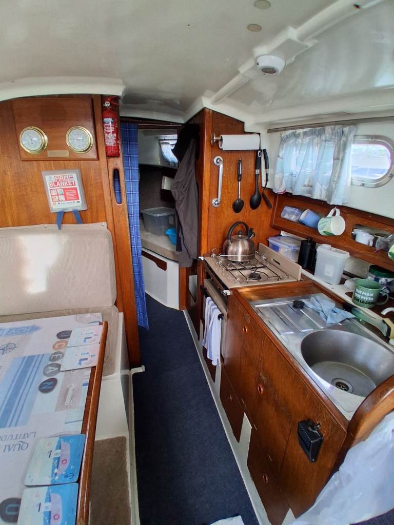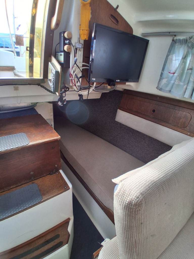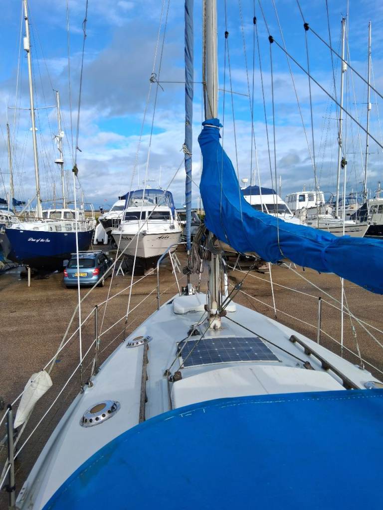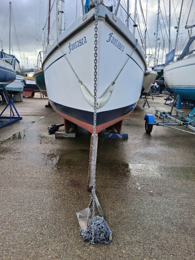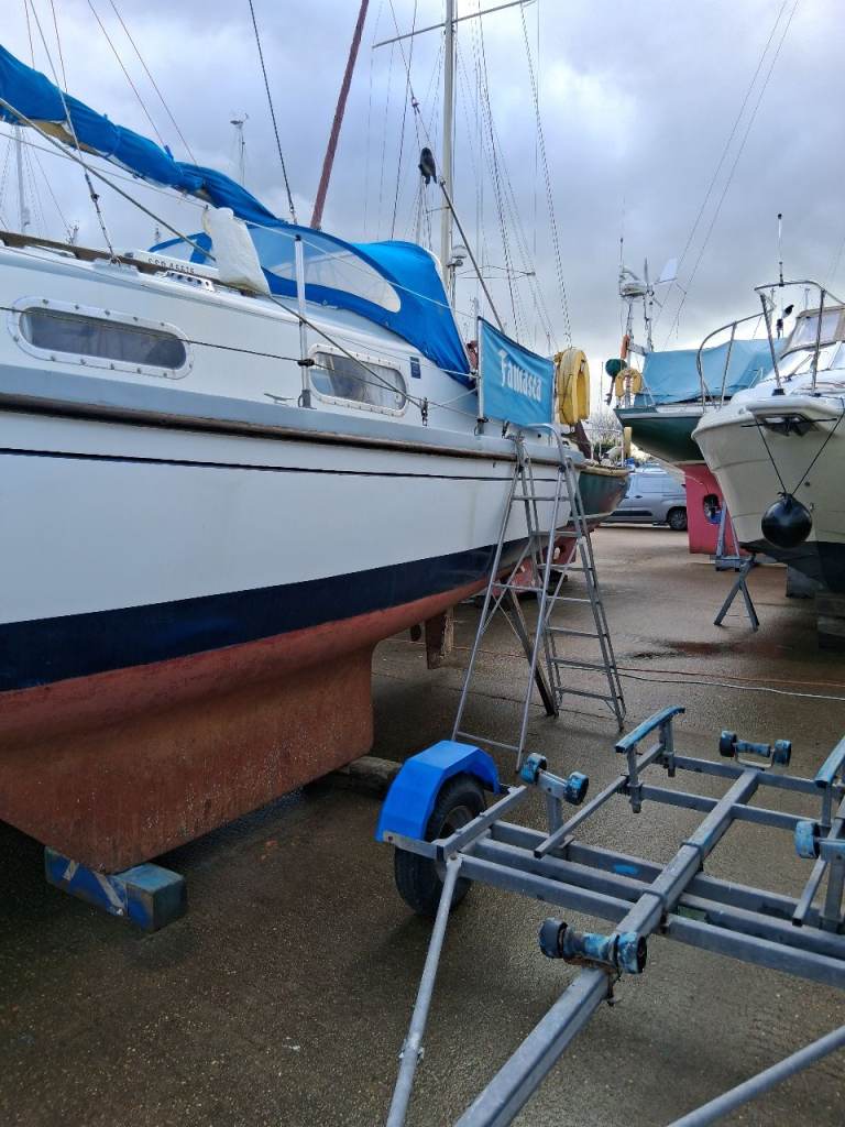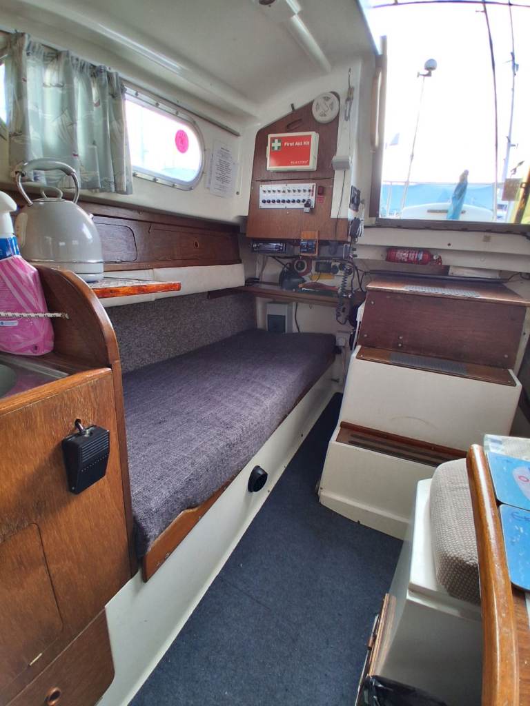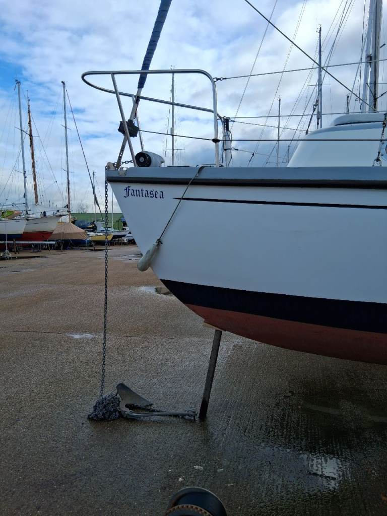 1974 bilge keel. Recently rebuilt Yanmar 2gm20 diesel. Six berths, 6ft+ headroom. Autohelm with remote control. Two GPS one linked to dsc radio. Diesel heater. 240v heater in saloon and heads. Mains hook up. Solar panel charging both batteries. Good mainsail and spare. Fair genoa and spare. Bilge pumps. Marine toilet. Mostly LED lights. Two burner cooker with grill and oven fed by two Gaz bottles. Boarding ladder and outboard bracket on stern. Fenders, mooring lines, spray hood, dodgers, cockpit cover. 2.7m inflatable. When weather allows it will be antifouled and non-slip deck paint renewed. If not paint supplied. Out of the water at Walton-on-Naze, Essex, for viewing