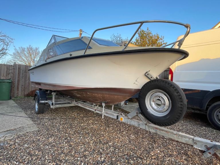 The boat sits on a galvanised Snipe break back trailer with good tyres and a spare. It’s rated to 1300kg. It’s braked but they will need looking at if you want them working, and it needs a new jokey wheel. I recently towed it about 65 miles and it towed very well. No outboard is fitted on the boat so the trailer is currently nose heavy (that’s how I towed it).