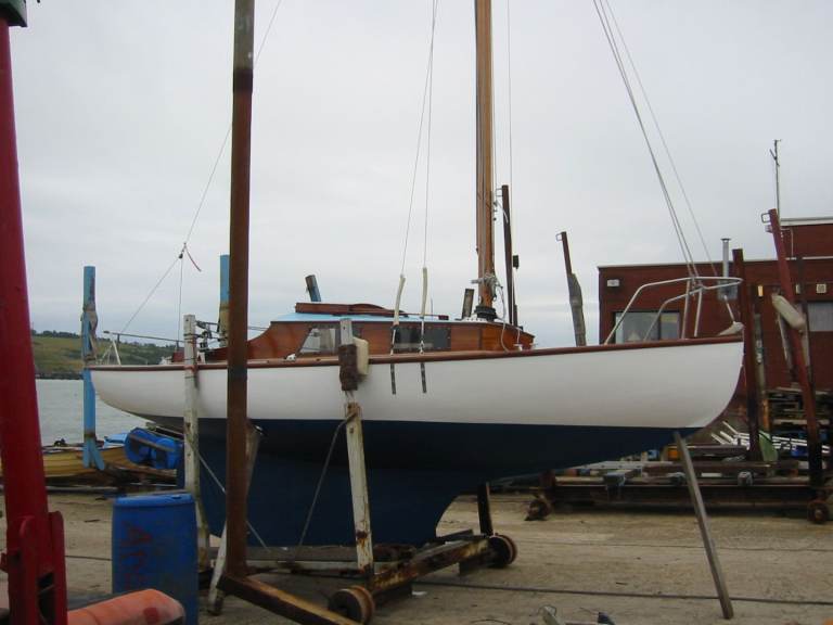 Carvel spruce planking on oak skeleton, ie, oak keel, stem, sternpost and ribs. Fastenings of copper and bronze throughout. Main deck, marine ply. Coachroof, mahogany and marine ply. New iron keelbolts fitted 2007, deadwood and internal hog repaired at same time.