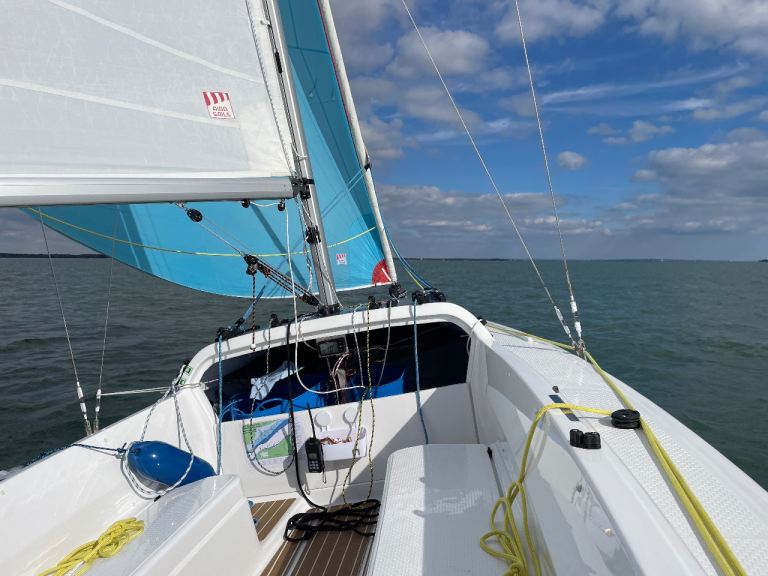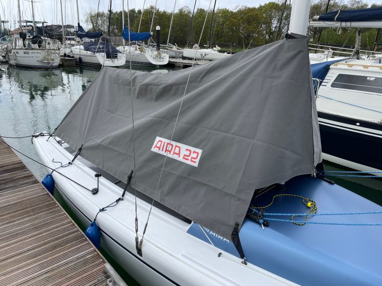 Aira 22 now marketed by RS Sailing, safe family dayboat, very stable ballasted keel, GRP construction with buoyancy tanks. Sporty performance, jib on fuller, cruising chute on furler and retractable bowsprit.