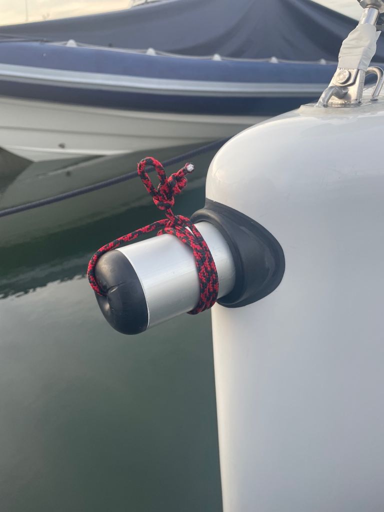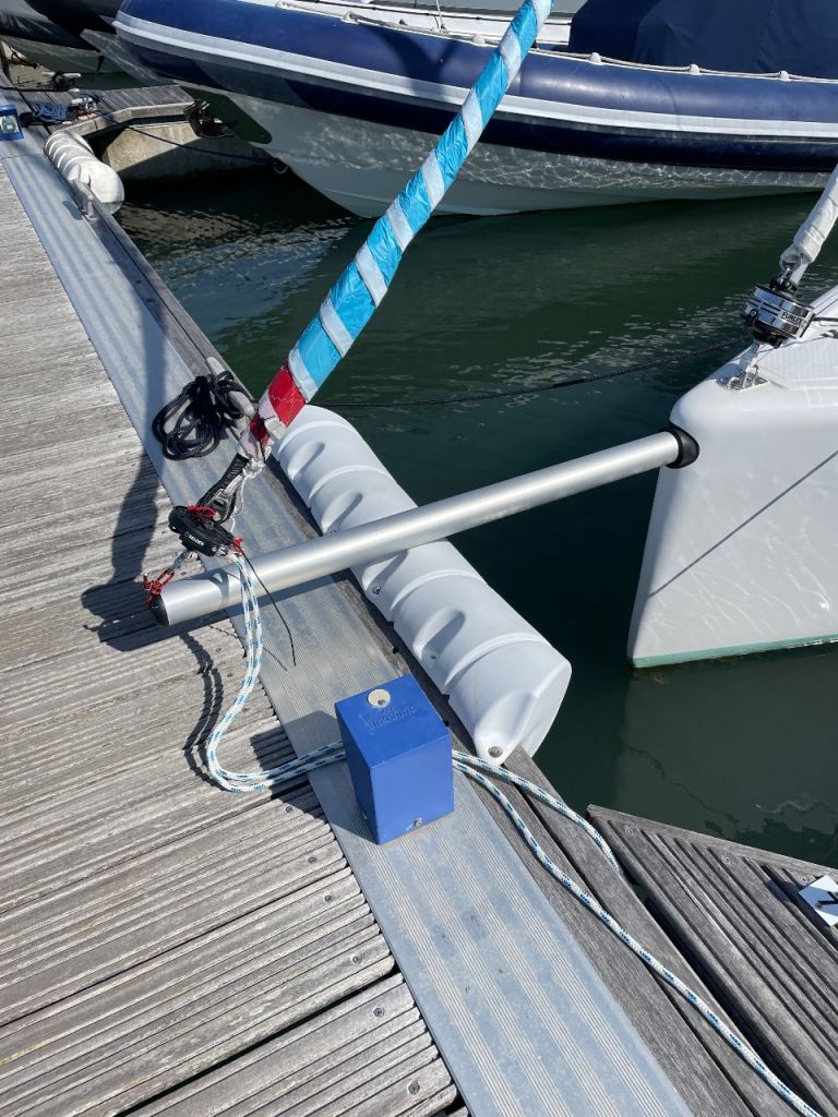 Large cockpit seating with cushion seats and backrests. Electric retractable motor with lithium battery, shore cable and Victron charger. Raymarine speed and depth.