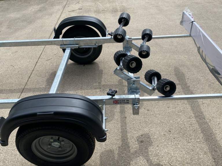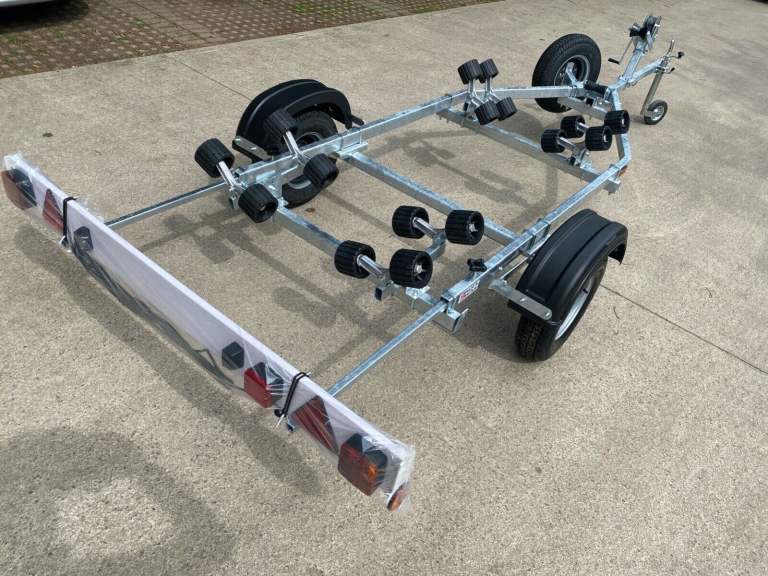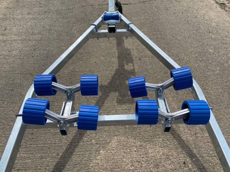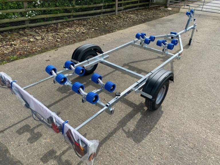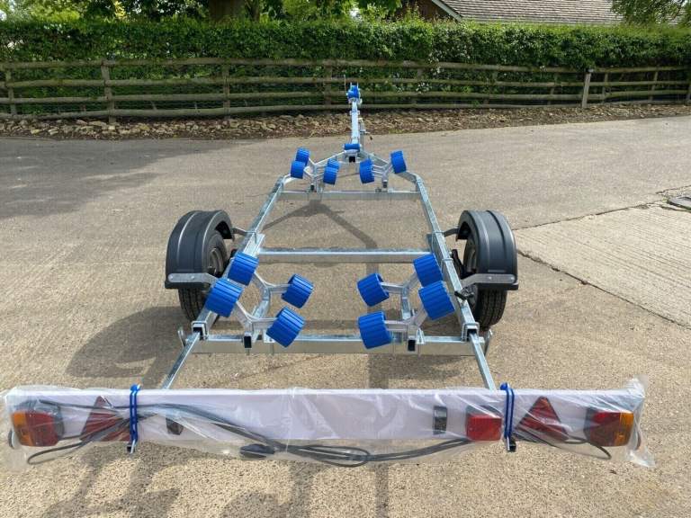 This model advertised is the Extreme 750KG Maxi Roller Galvanised trailer with lighting board. Our pictures show the exact trailer you will receive but are for illustration purposes, you can choose the specification and the colour of the rollers to match your boat, (red, black, blue, orange, green, grey). We have others available, this advert is for the trailer and lighting board only. You will of course receive a Brand New trailer with lighting board (optional spare wheel) which will be built to order typically in the next 7-14 days, please check with us for build times.