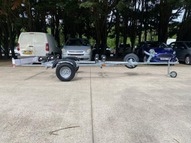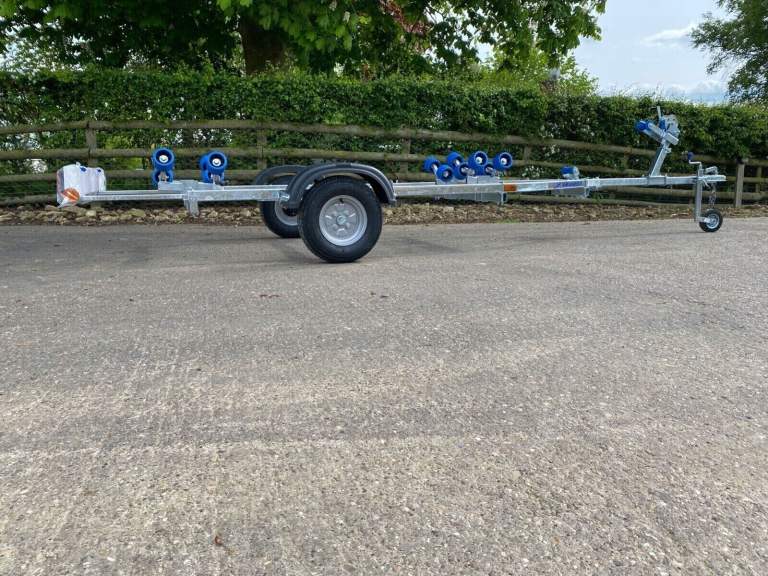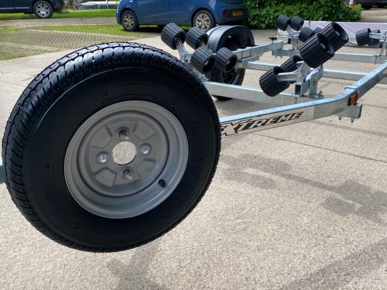 A brand new Extreme 750KG roller trailer suitable for RIBs up to 5M and solid hull boats up to 14' and 605kg, sail boats/dinghies up to 16' (with overhang) with 24 months warranty from collection or delivery. The price includes VAT and we can deliver anywhere in England and Wales or collection is from Stratford Upon Avon.
