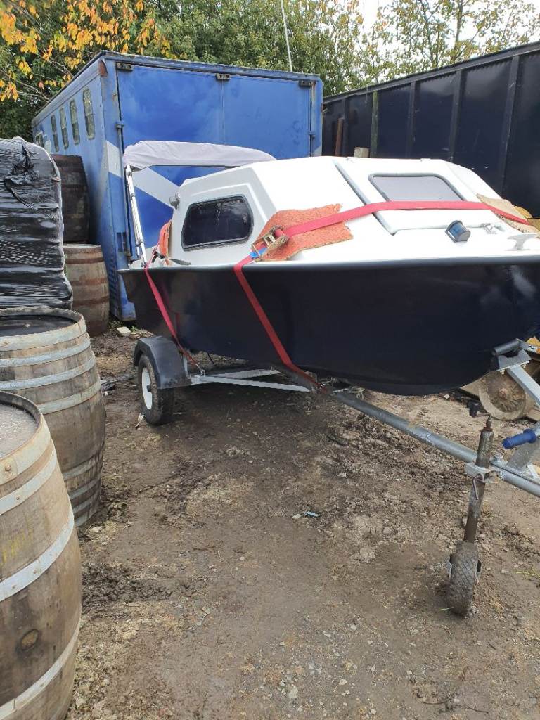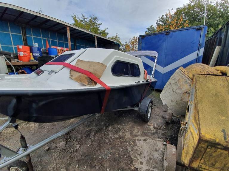 14ft fishing boat with cabin in really great condition comes with 5 horse power 4 stroke outboard motor and other bits and pieces for boat it also comes with trailer and canopy