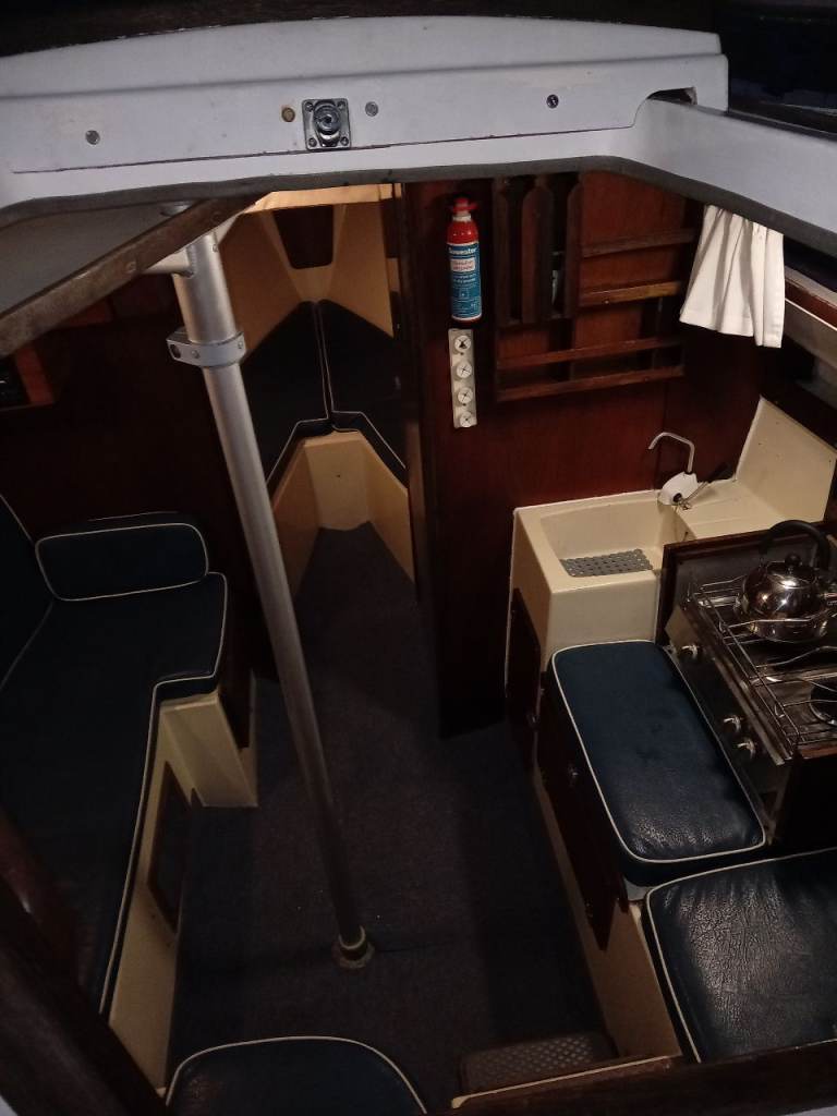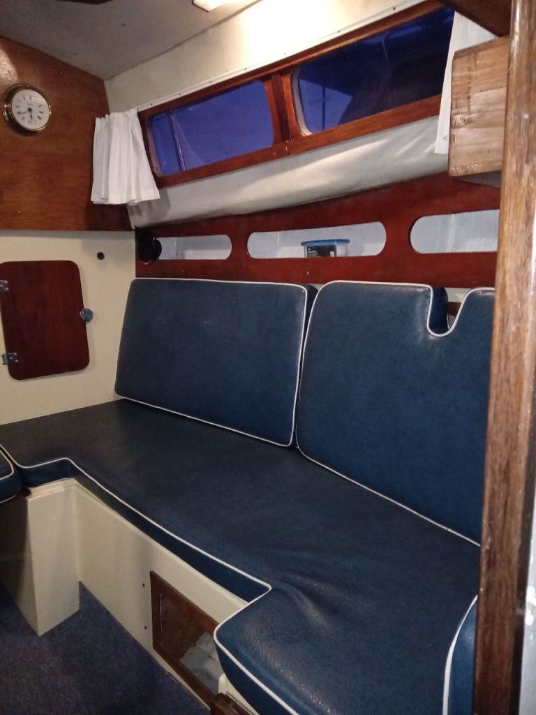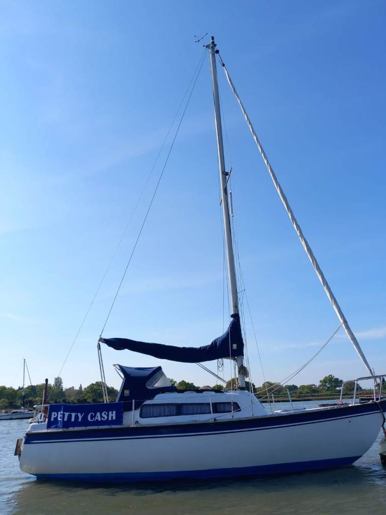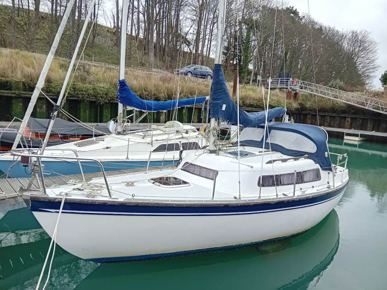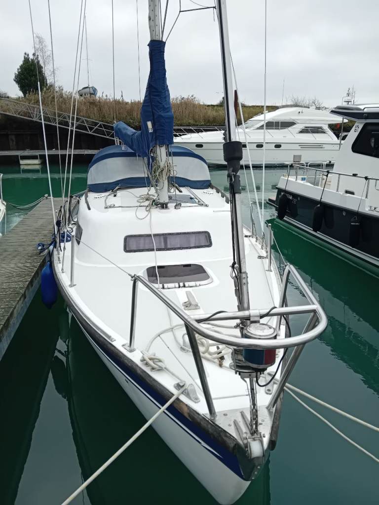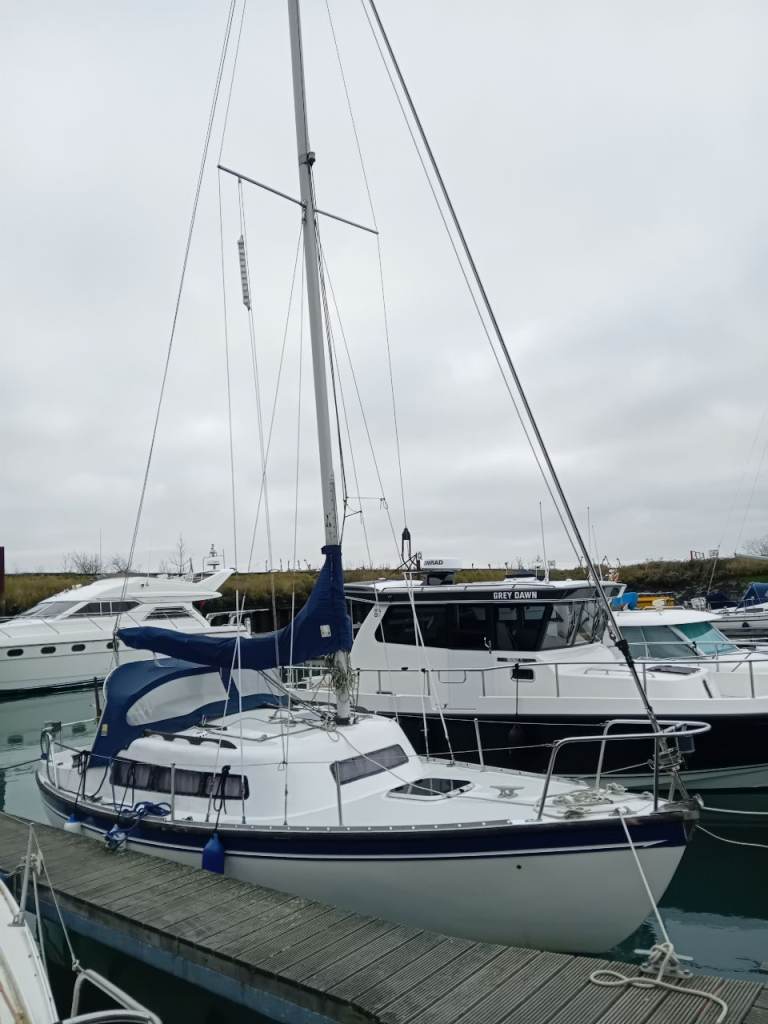 Newbridge Virgo Voyager 23ft GRP sailing yacht. Triple keel. Standing headroom inside.Lifted and antifouled last Summer. Plastimo roller reefing to foresail. Slab reefing mainsail with all lines fed to cockpit. Yanmar 1gm10 diesel engine serviced by French marine services with new exhaust elbow in 2024, prop shaft seals replaced in 2025 so bone dry now. Spray hood restitched by Sail and Cover Ipswich Winter 2024. Spray dodgers resewn Winter 2024. 5 berths. Blue vinyl seat covers. Swimming ladder. Auxiliary outboard motor bracket. Nasa Duo depth sounder, speedlog display unit new 2024. Deck anti slip repainted 2024 light grey. VHF radio with GPS. Tricolour mast top nav light and nav lights, masthead wind direction indicator. Automatic and manual bilge pumps.Anchor with chain. Jabsco sea toilet replaced 2025 with seacock serviced. Located in Levington marina on the river Orwell for Winter storage. Nice boat for the East coast as it can dry out on a swinging mooring.