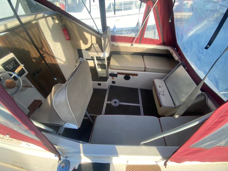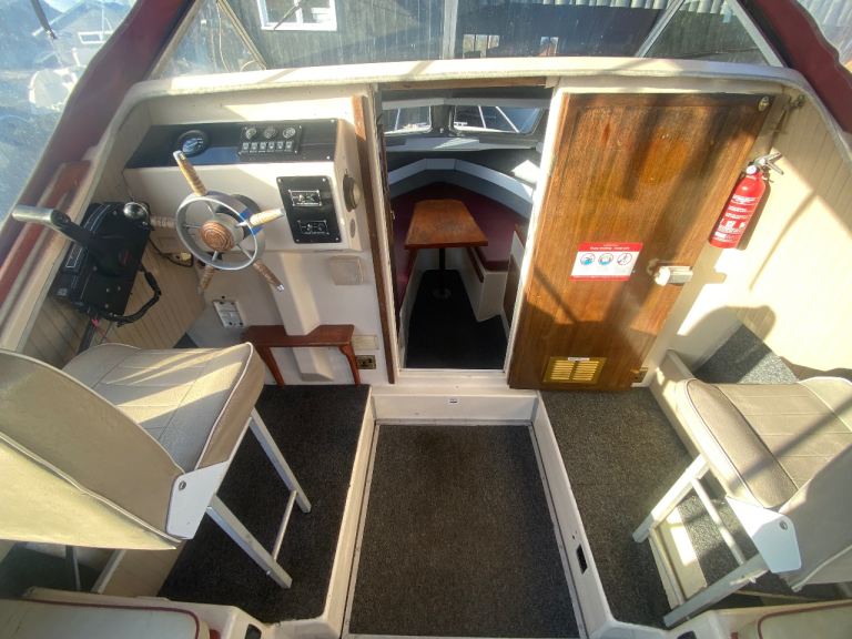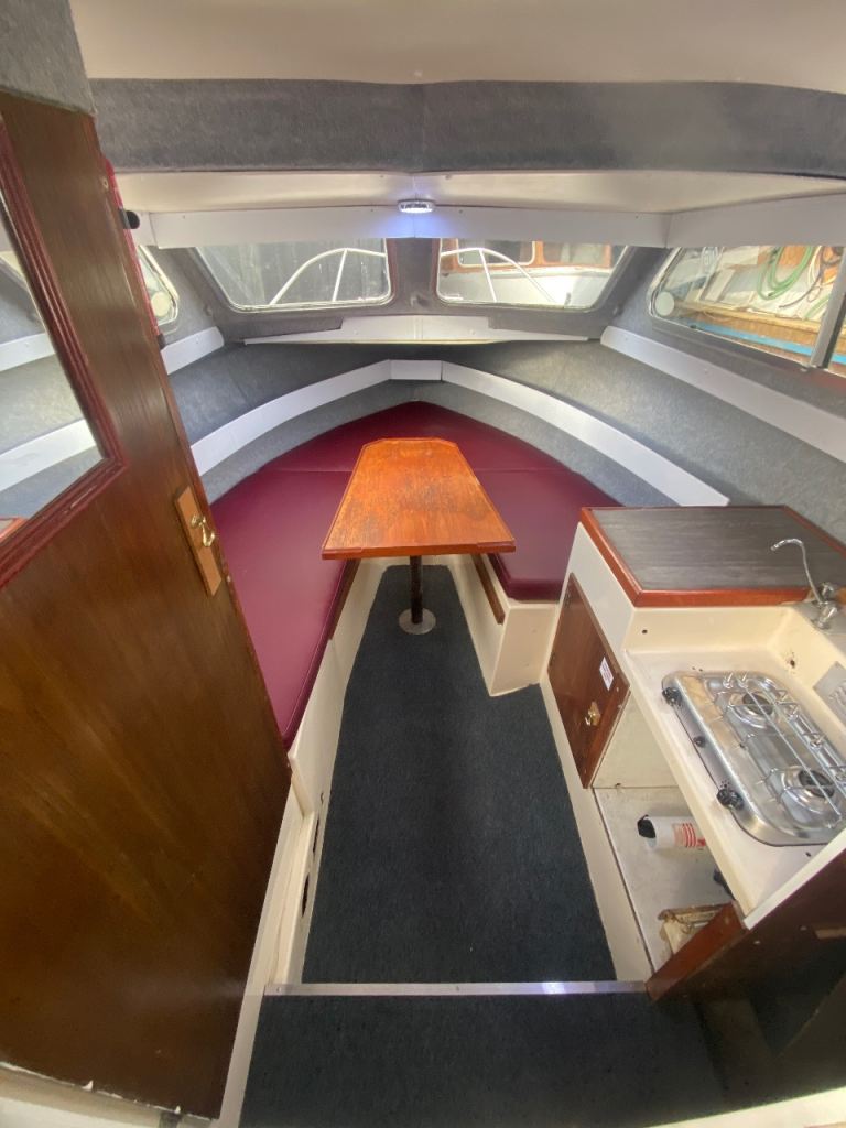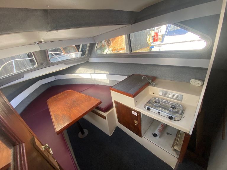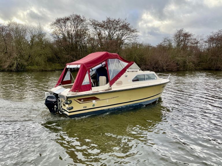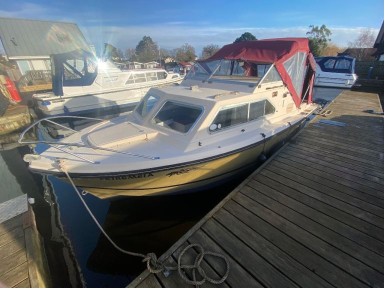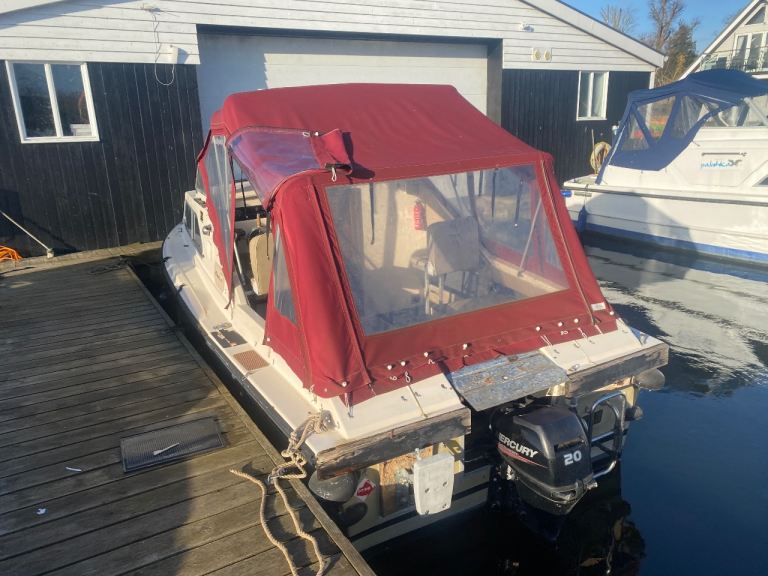 4 years boat safety certificate, powered by a economical electric start, power tilt mercury 20hp Fourstroke outboard engine, original gelcoat, 2 berths, Canopy and upholstery in good condition, toilet compartment complete with pump out toilet, galley area storage, twin burner hob and a sink with cold water supply.