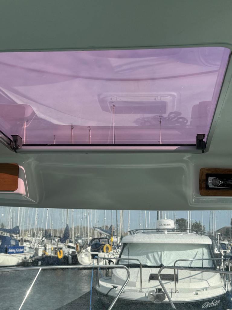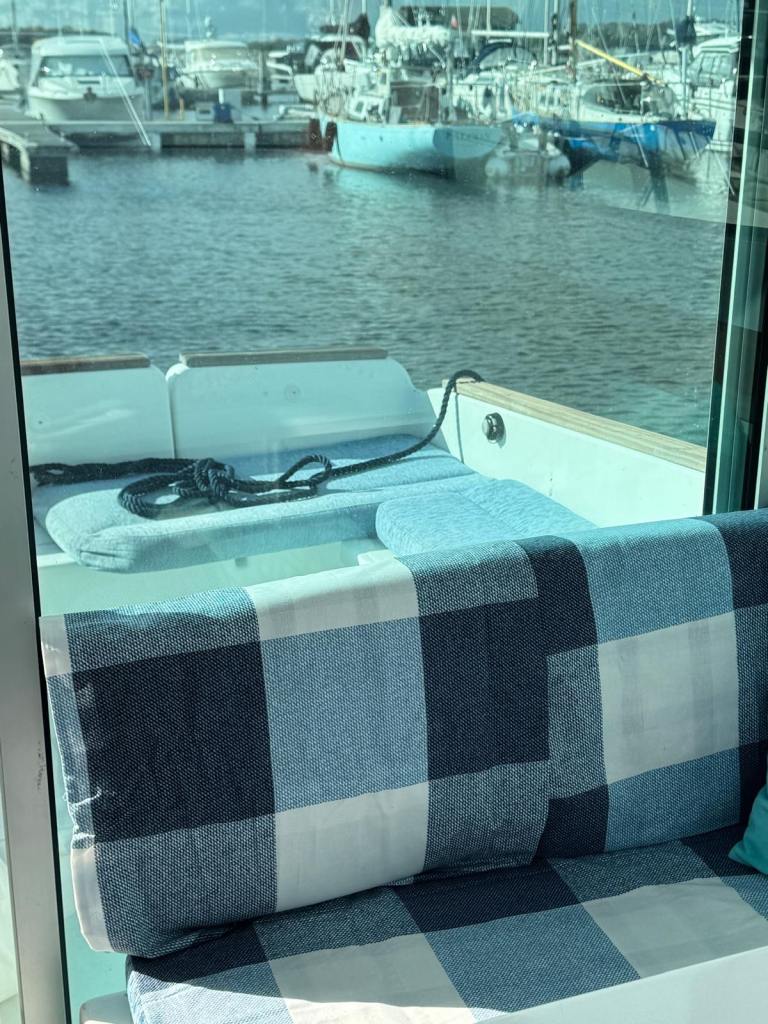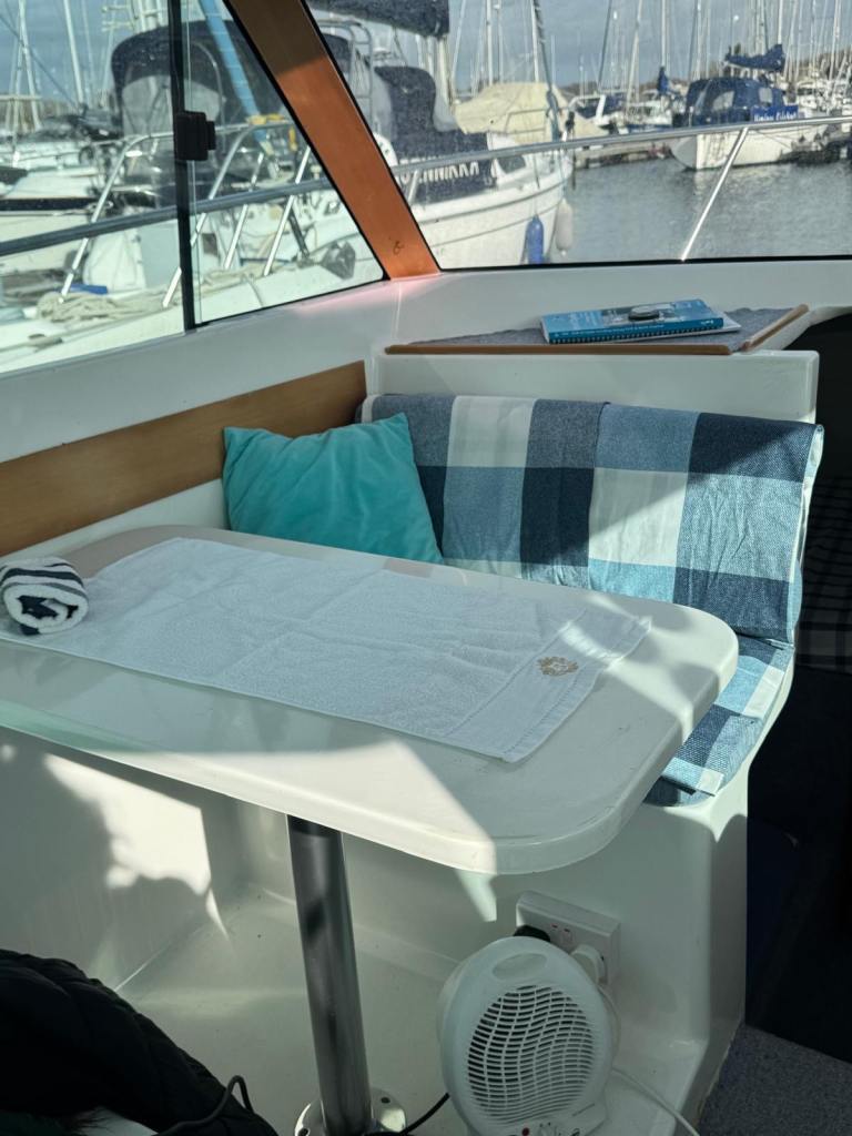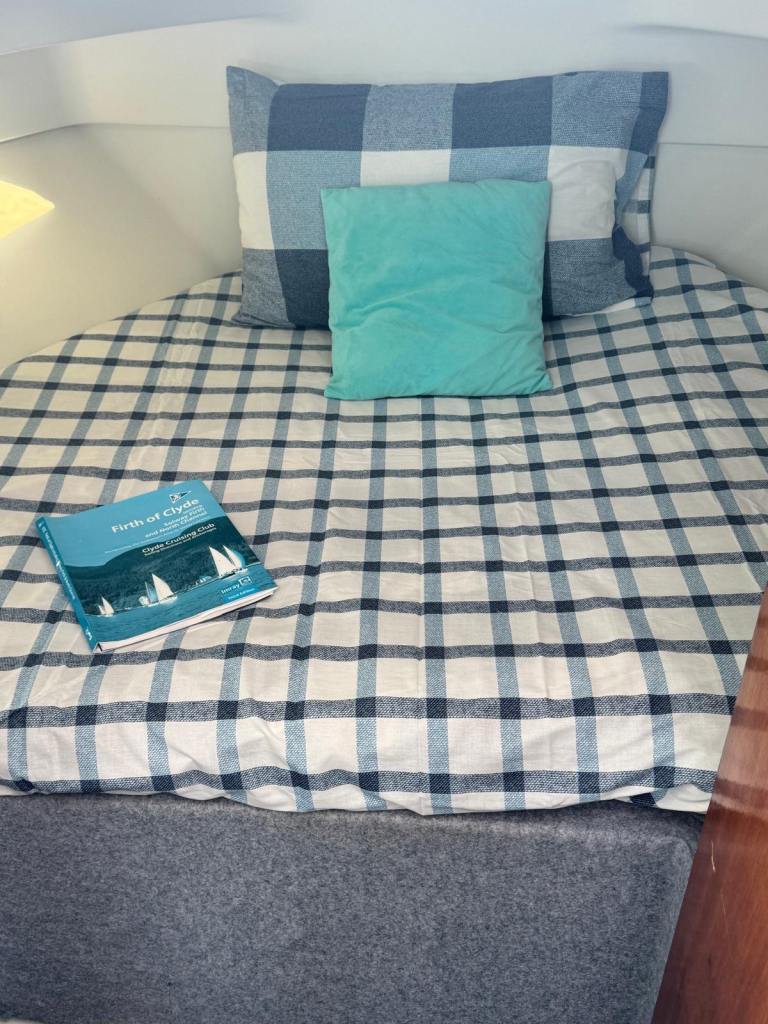 * Lower cabin: There is a forward double berth, a very long single width berth and the head contains a sink and a flushing sea toilet