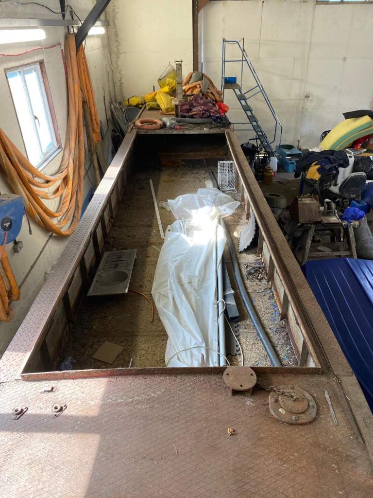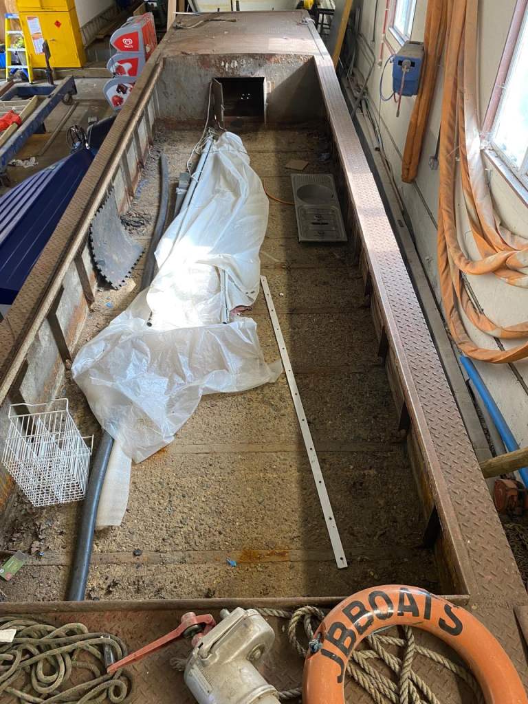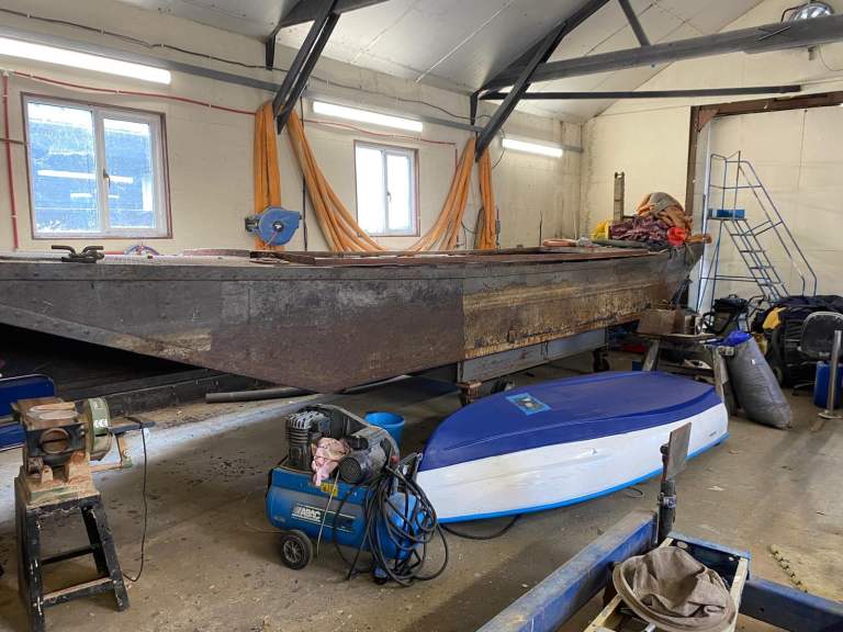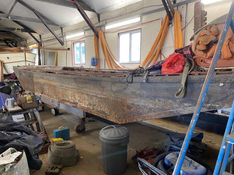 Steel work boat dumb barge houseboat ,34ft . Nice looking barge all riveted. I think it would have been built in the 1930s. It weighs approximately 6tons. It has a concrete floor about 4” thick. It needs welding all along the waterline. It’s to good to scrap . It would make a great workboat again or a nice house boat conversion. I can lift on to a lorry for transport. £1250