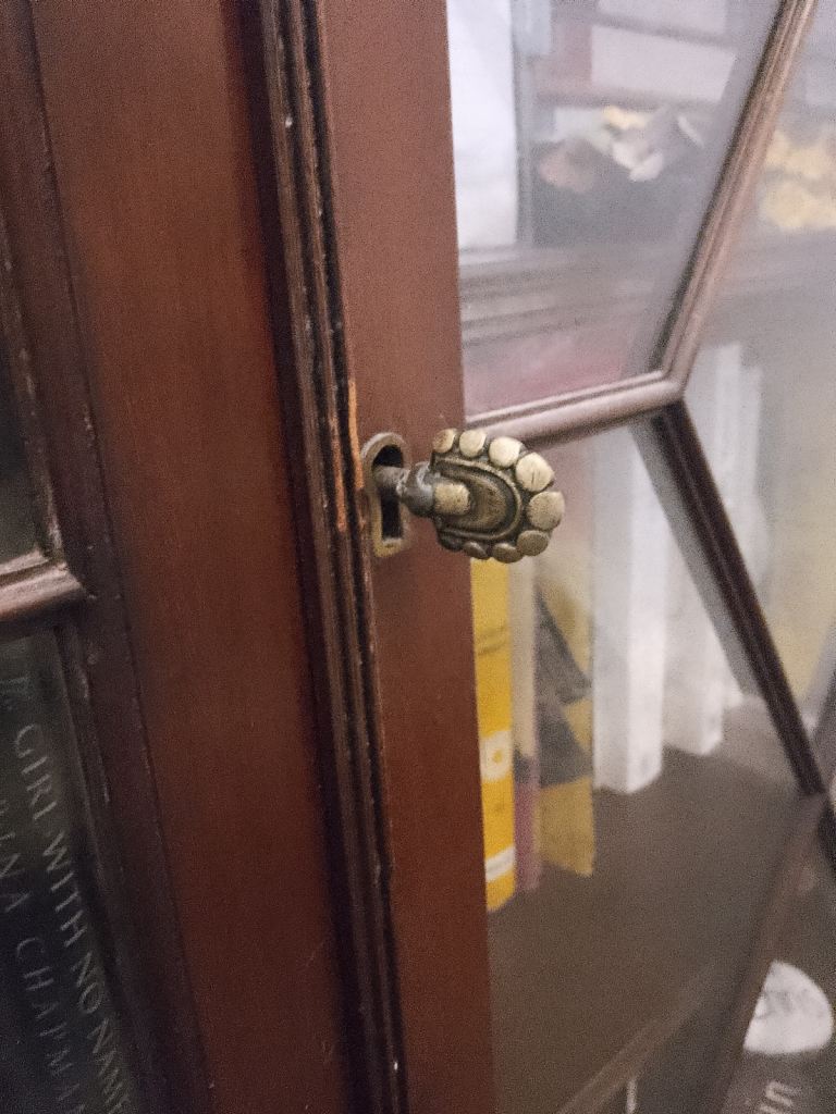 Antique bookcase / display cabinet with lockable glass doors and three adjustable wooden shelves.