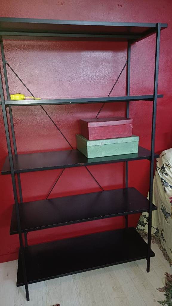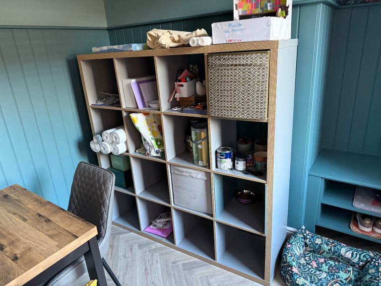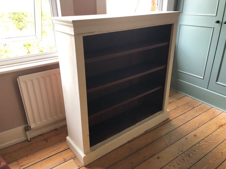 PLEASE NOTE - the bottom left section of this bookcase intentionally was built with no back to access cables and sockets behind. As pictured, it has a piece of plywood pushed up against it to make a temporary back.