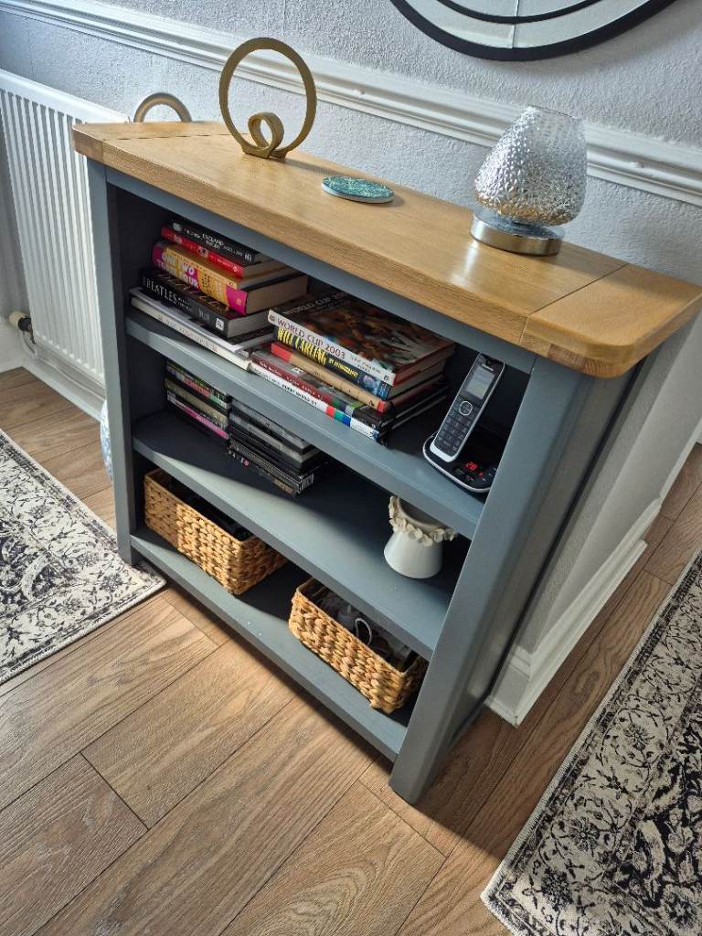 Oak and slate grey bookcase (Marbury small bookcase). H90 x W90 x D30. Excellent condition.