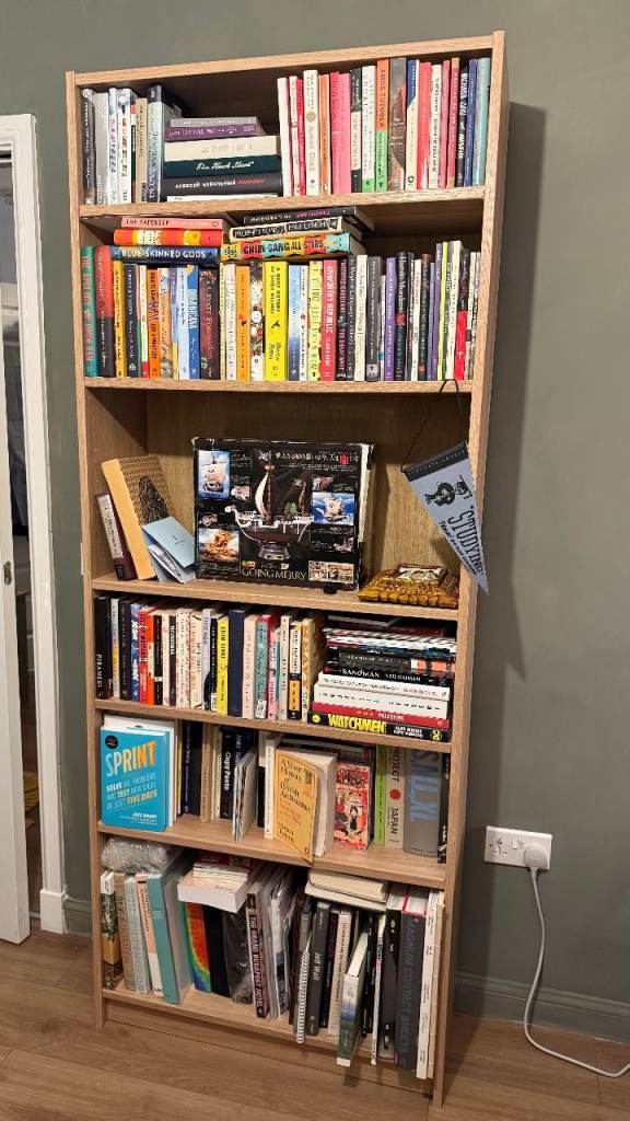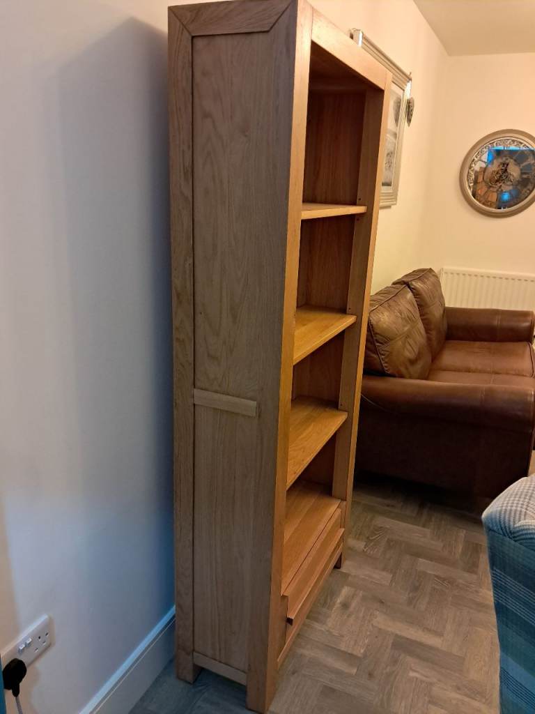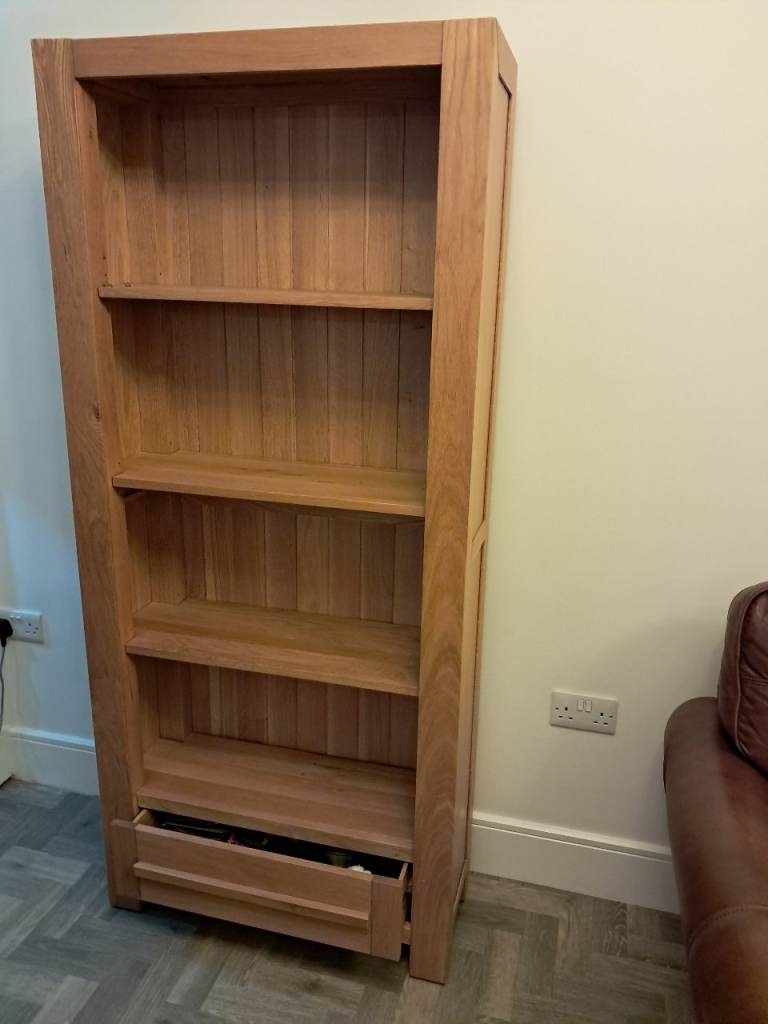 Natural oak bookcase with 4 shelves and a pull out drawer. Excellent condition, full working order. Height 180cm width 80cm