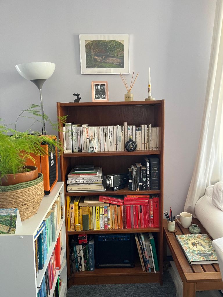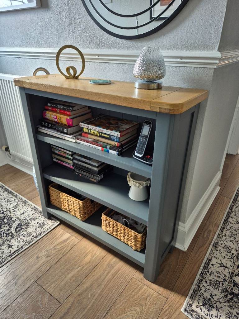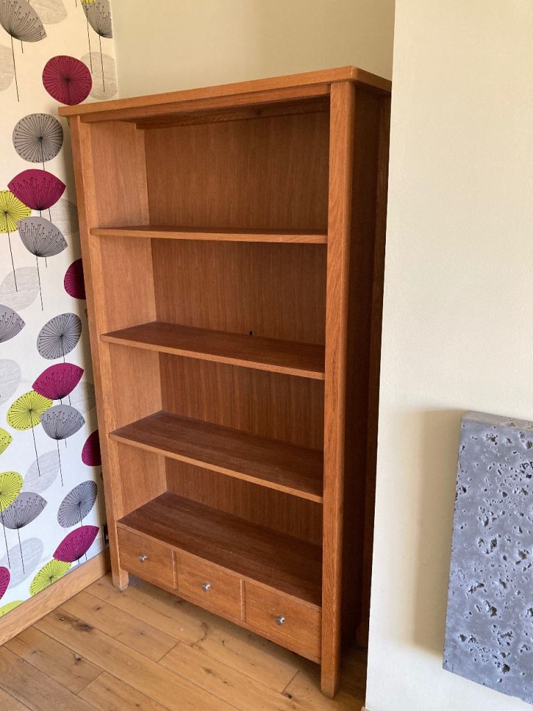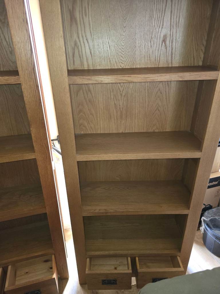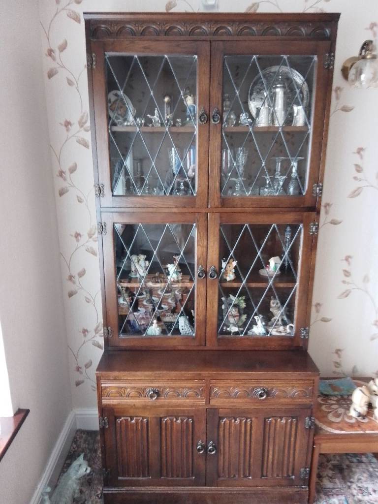 Wood bros.dark oak display cabinet and book case. comes apart for transportation real lead light doors 3shelves 2 drawers in excellent condition. currently used as a china display case. Contents of the cabinet not included