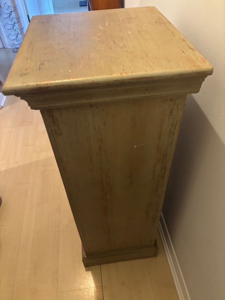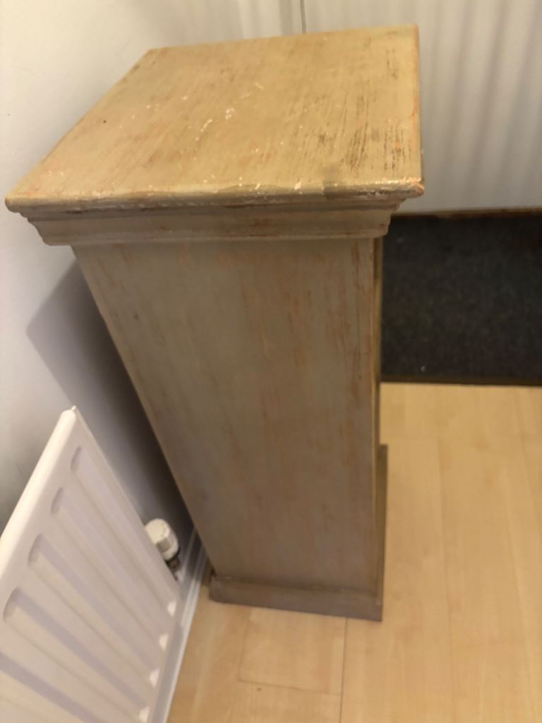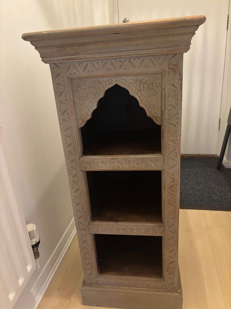 Pale reclaimed wood bookcase/shelf unit. Size is 36” high by 16” wide and 14” deep. Some small flaws due to the nature of the wood.