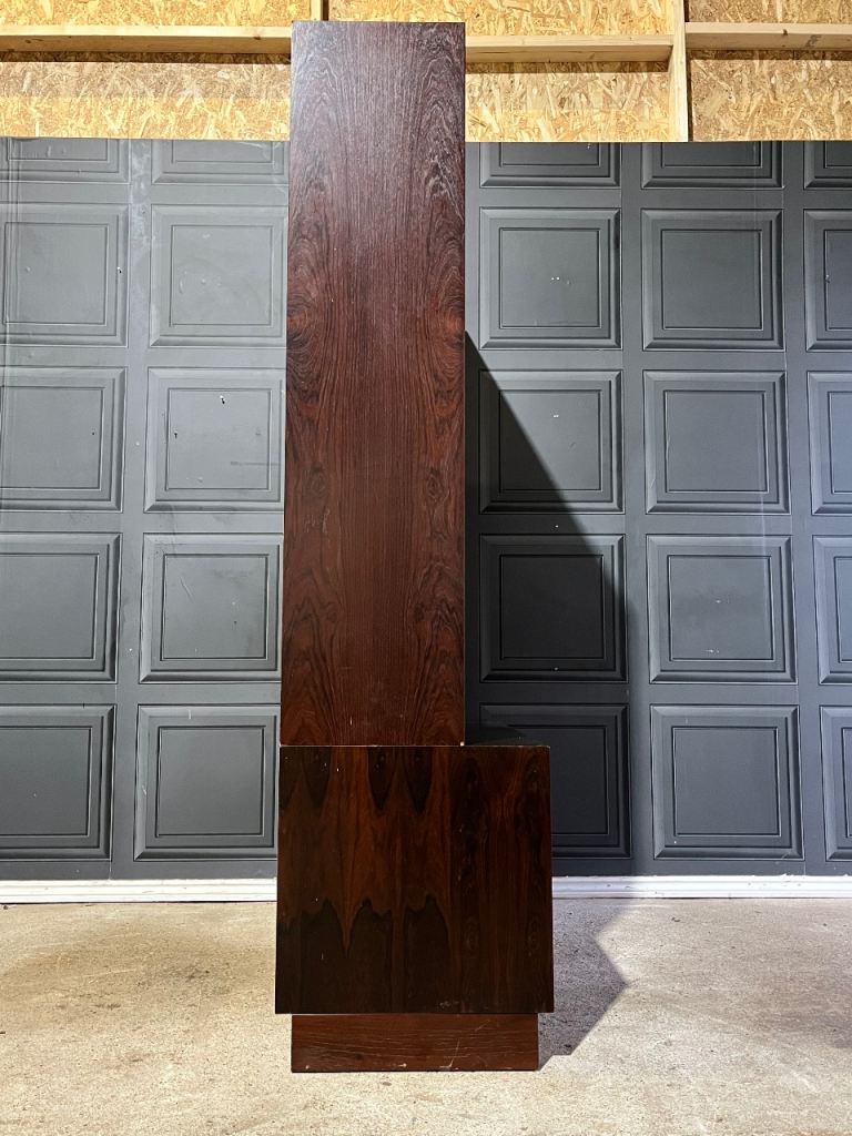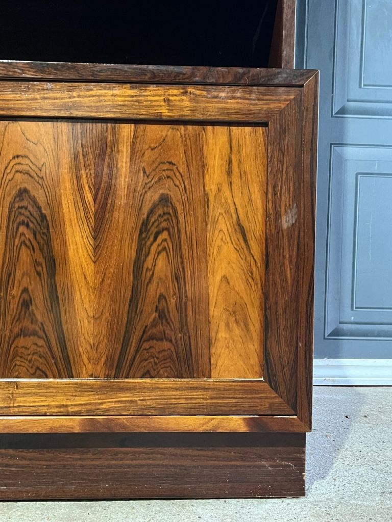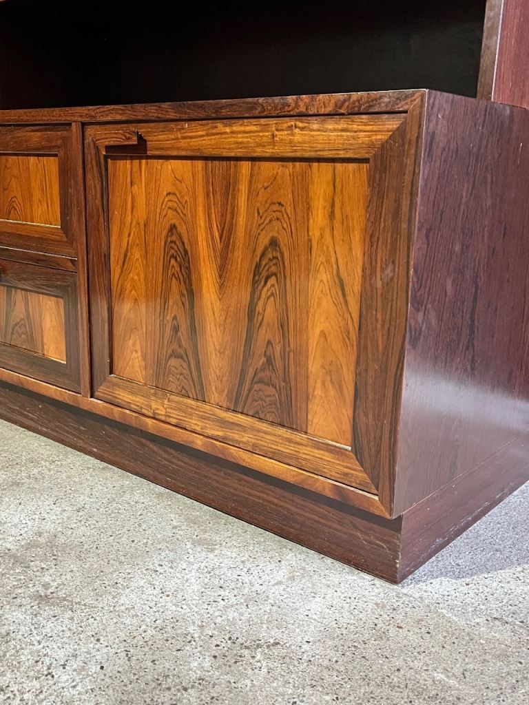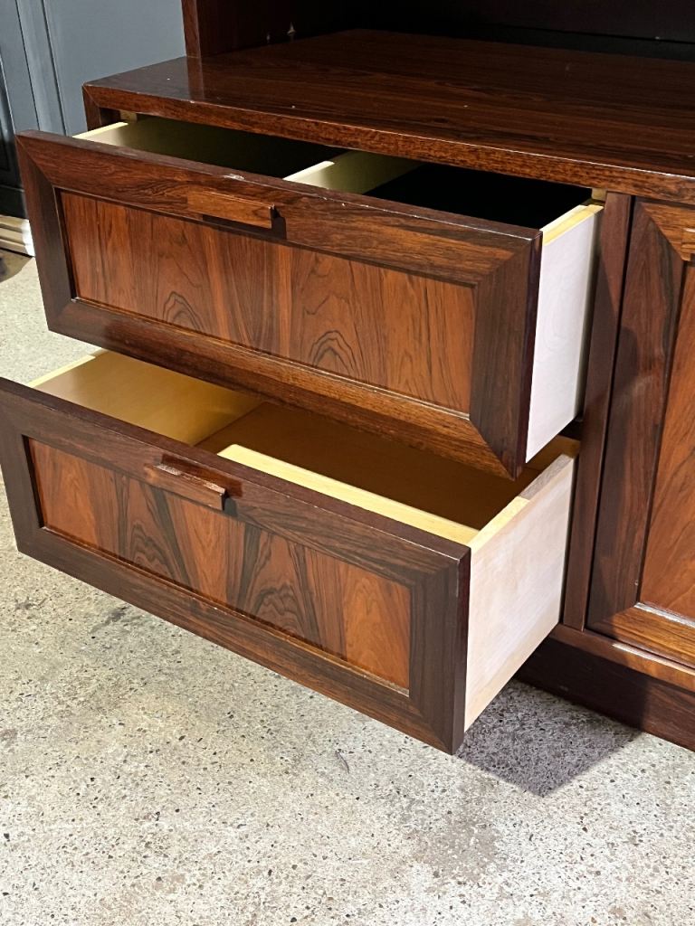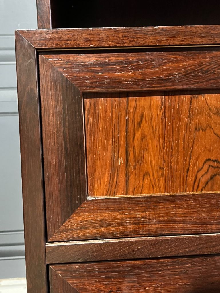 Active through the mid-20th century, Sejling Skabe specialised in producing highboards, sideboards, bookcases and modular storage systems crafted from highly figured teak and or rosewood. Their work is instantly recognisable for its balanced proportions, meticulous detailing and quiet functionality, all hallmarks of classic Danish Modern design. Unlike many larger manufacturers of the period, the company produced in smaller volumes, placing a clear emphasis on quality over quantity. This approach aligned perfectly with designers such as E.W. Bach, whose thoughtful, disciplined eye for form and practical utility helped define the character of these pieces.
