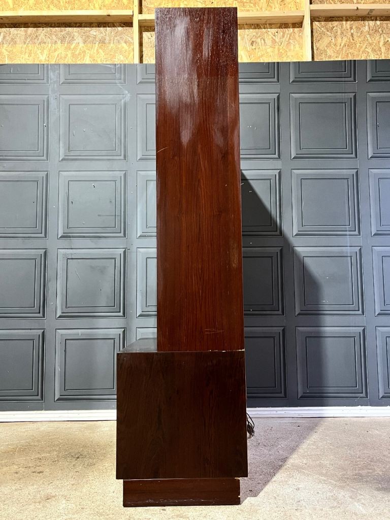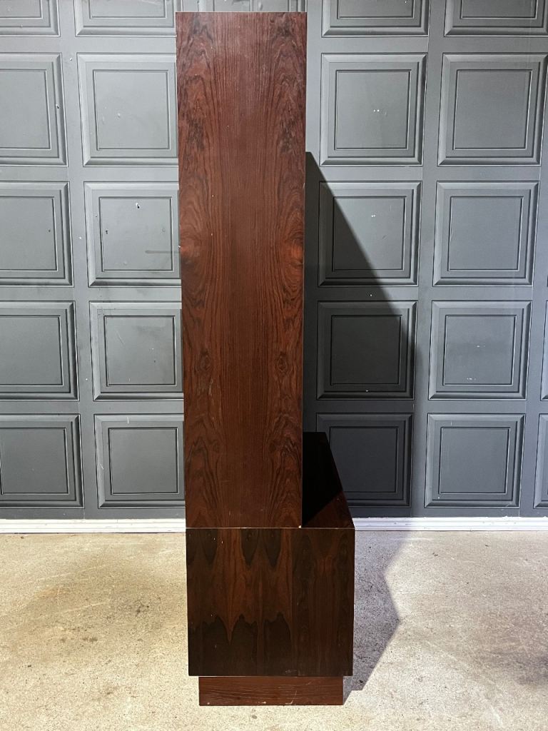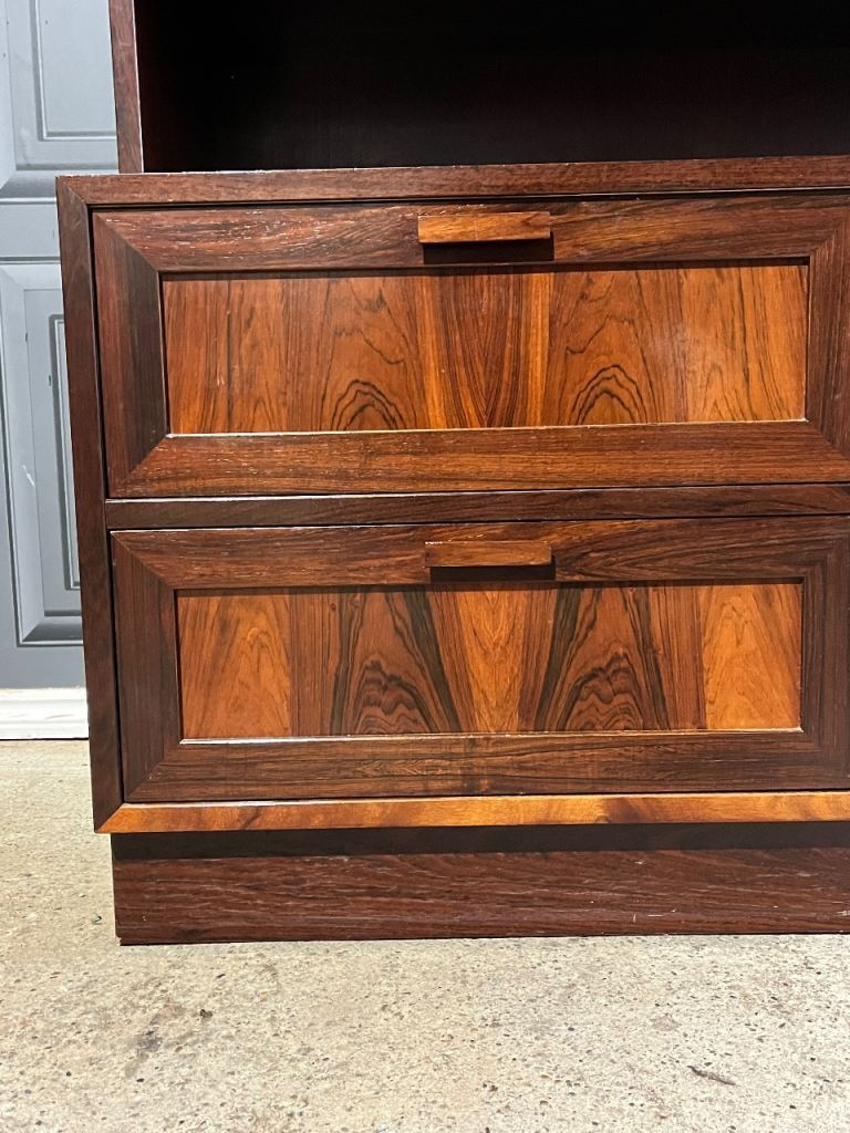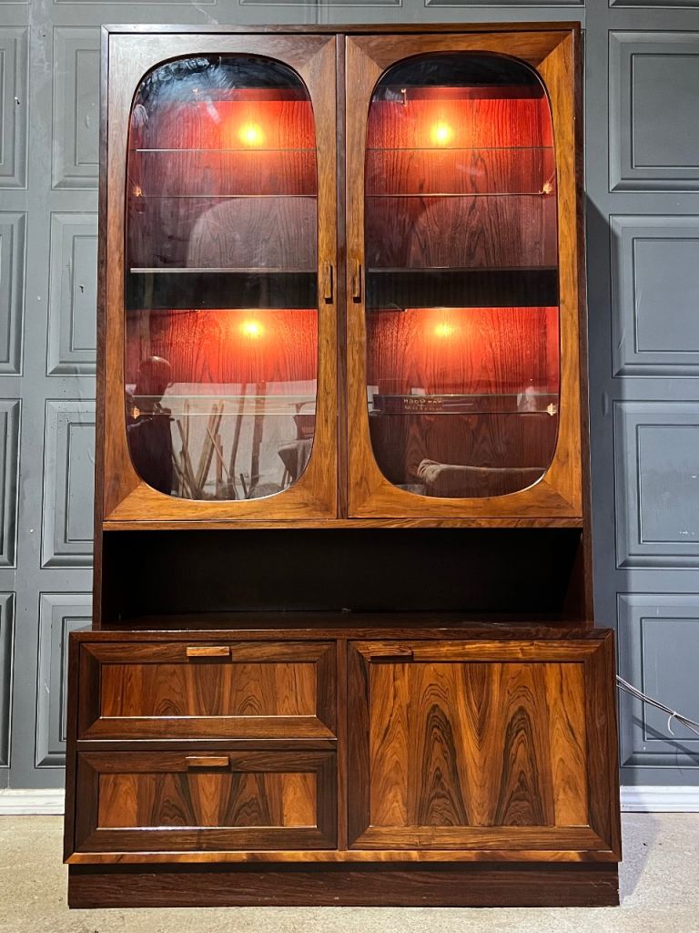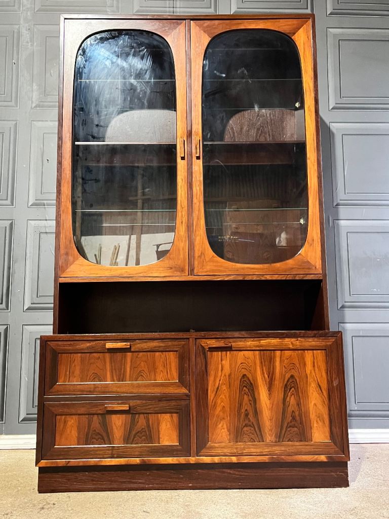 This listing is for an exceptional Danish Sejling Skabe rosewood display cabinet designed by E.W. Bach, a striking example of refined Scandinavian craftsmanship. Made from superb quality rosewood with a beautifully wide and expressive grain, the cabinet showcases the elegance and material richness that have made Sejling Skabe pieces so coveted. The upper section features distinctive oval glass inset doors, subtly influenced by Art Deco forms, adding a graceful sculptural element to the clean Danish Modern lines. Everything about this cabinet screams quality, wheather it be the materials chosen, the soft close doors or the art deco influneces just to name a few.