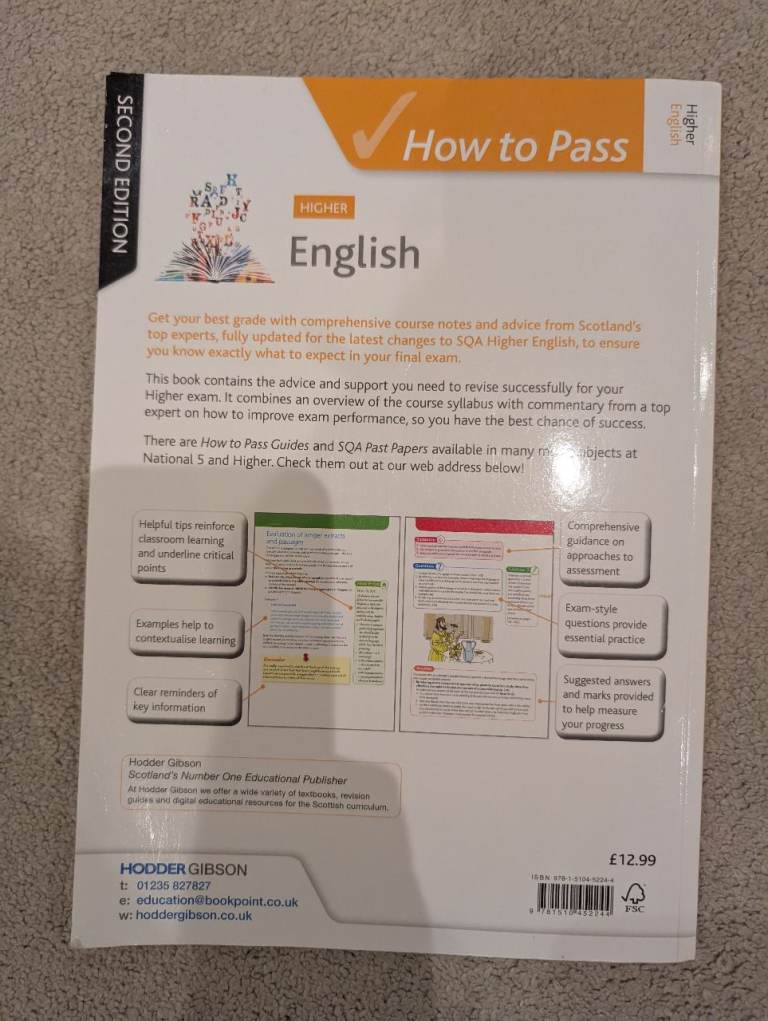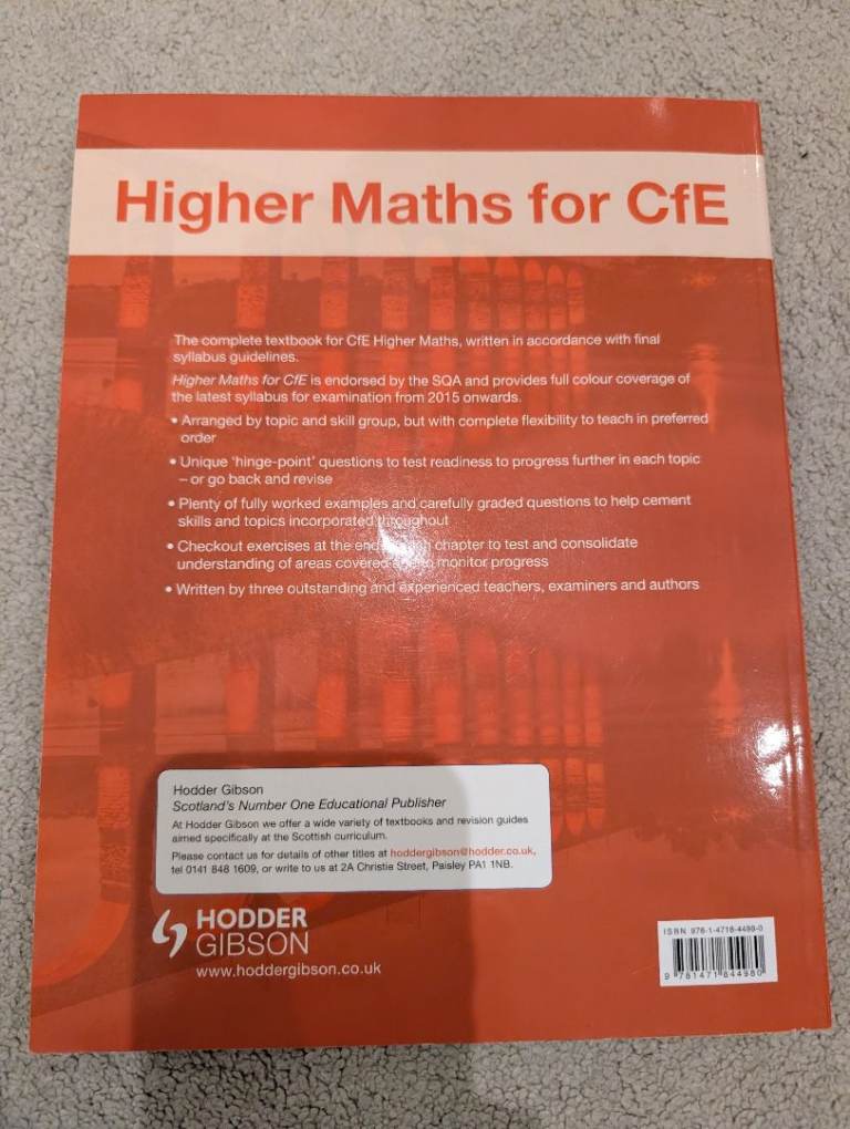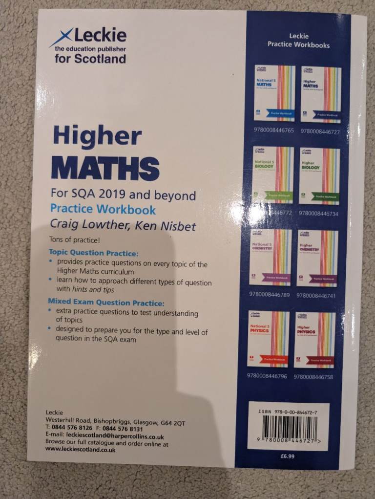 4 sqa Higher text books. Maths and English. Good condition. Barely used. 3 maths including Leckie and a thick hodder Gibson one. Plus one hodder how to pass higher English. These study books have lots of examples and clear explanations. Listing other sqa books too. Pick up jordanhill area.